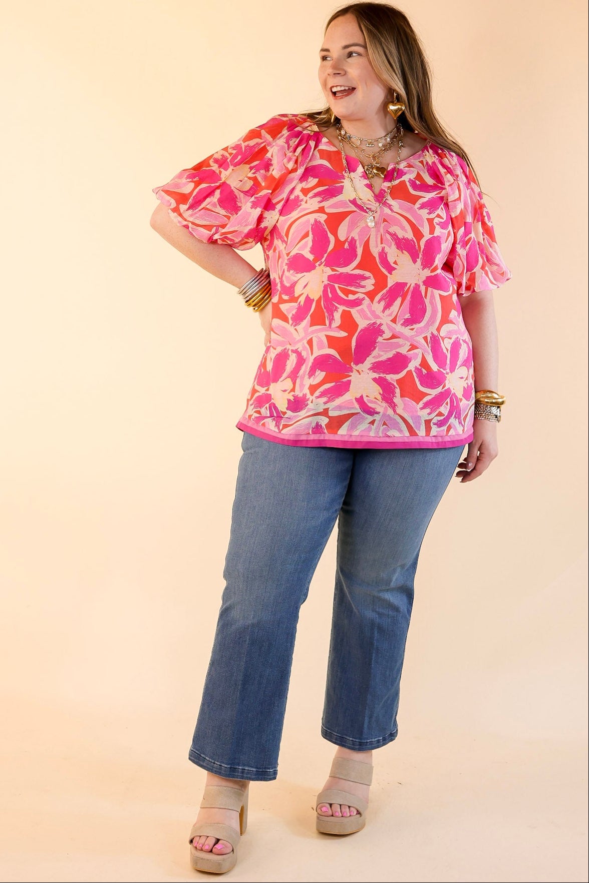 Embrace the vibrant beauty of spring and summer with the Paradise Petals top. Featuring a stunning floral print in shades of pink and magenta, this top captures the essence of tropical elegance. The short puff sleeves add a touch of whimsy, while the notched neckline offers a flattering and breathable fit perfect for warm-weather days. Whether you're heading to brunch, a casual outing, or a weekend getaway, this floral top brings a burst of color and style to any occasion.
