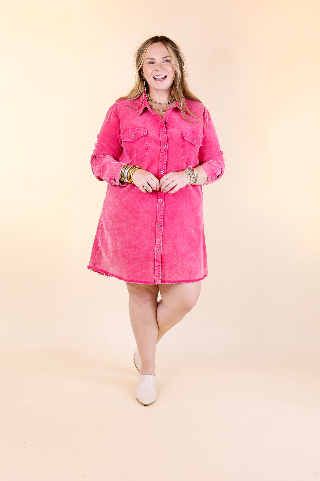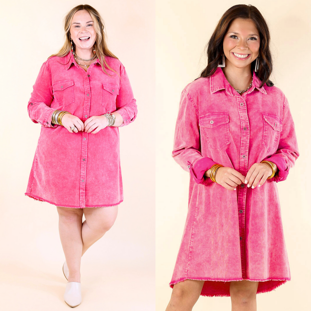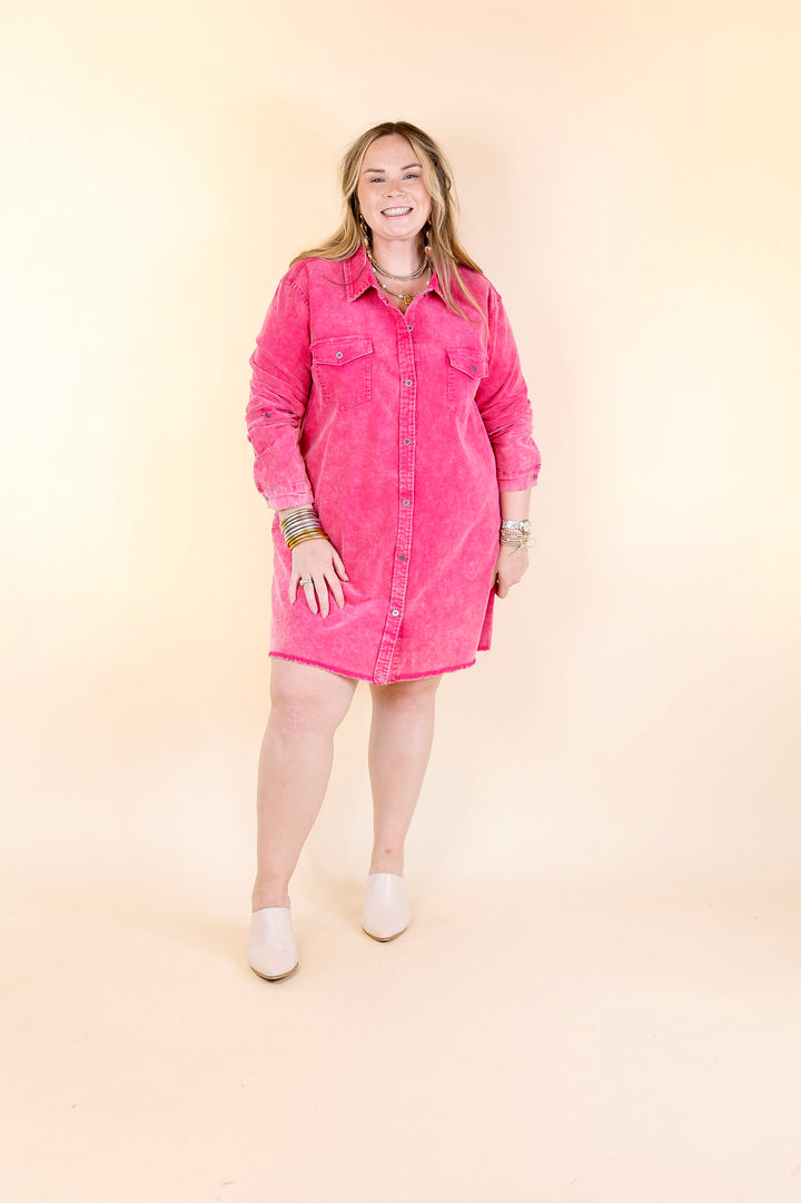 Patio Date Button Up Long Sleeve Corduroy Dress in Pink