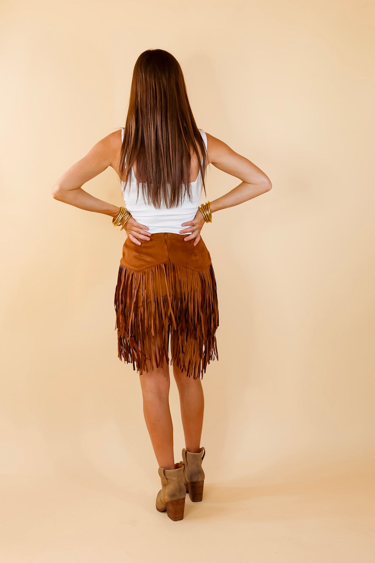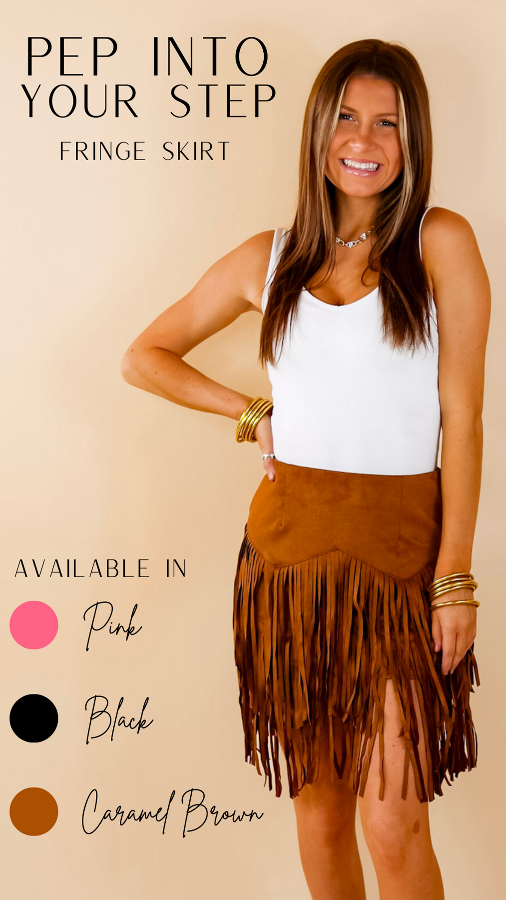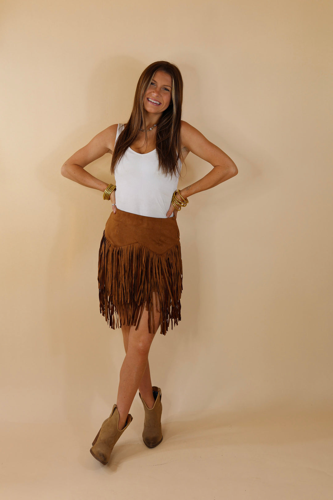 Pep Into Your Step Suede Fringe Skirt in Camel Brown - Giddy Up Glamour Boutique