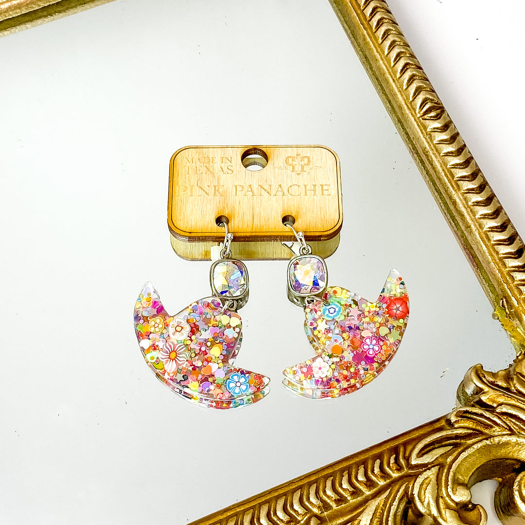 Pink Panache | AB Cushion Cut Drop Earrings with Multicolor Glitter Acrylic Cowboy Hat Pendant