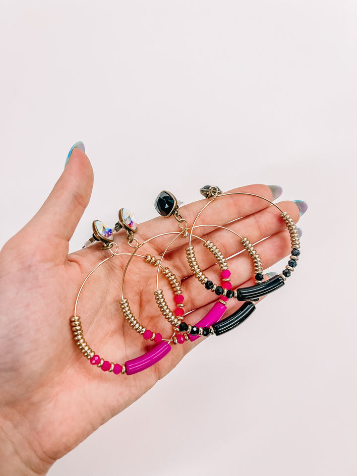 Pink Panache | Black Crystal Beads and Gold Beaded Hoop Earrings with Cushion Cut Crystals in Black - Giddy Up Glamour Boutique