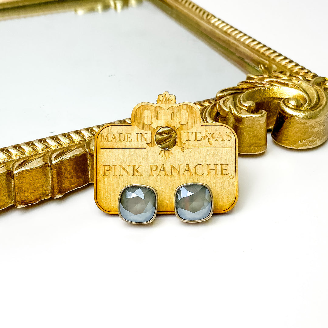 Pink Panache | Cushion Cut Silver Stud Earrings with Dark Grey Crystals