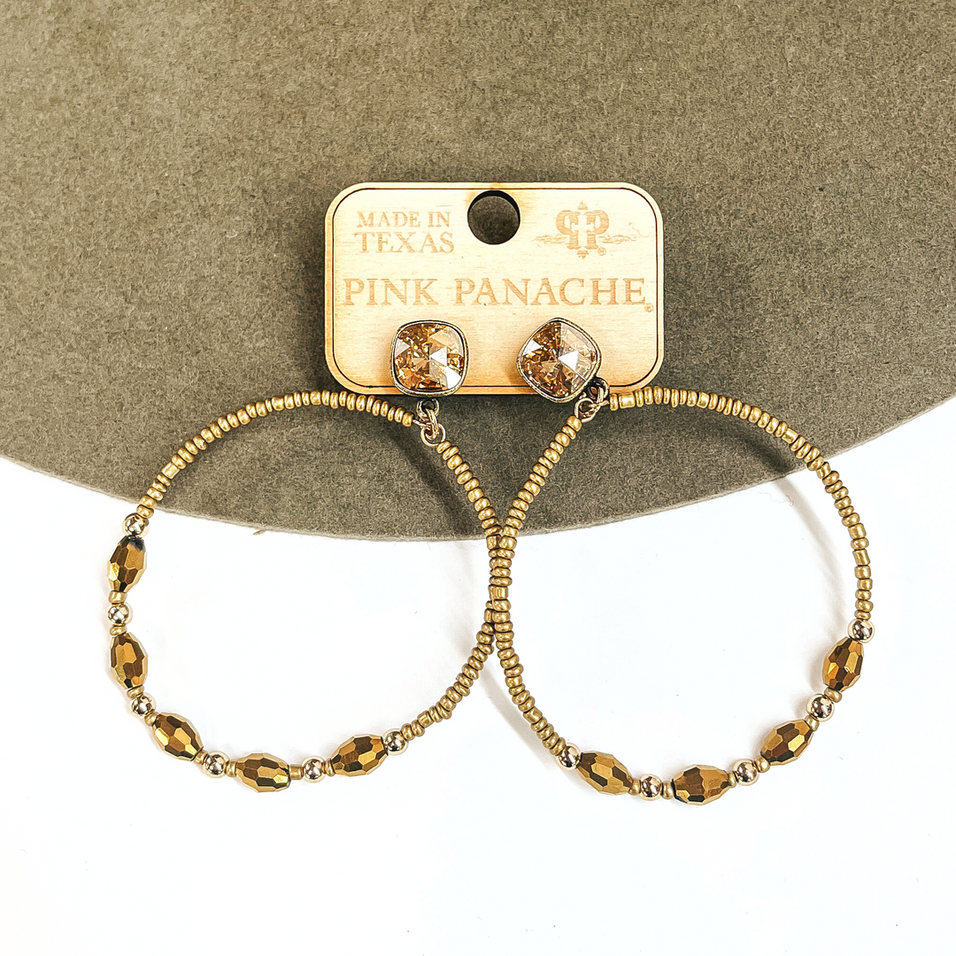 Pink Panache | Golden Shadow Cushion Cut Post Back Earrings with Beaded Circle Drop in Gold Tone