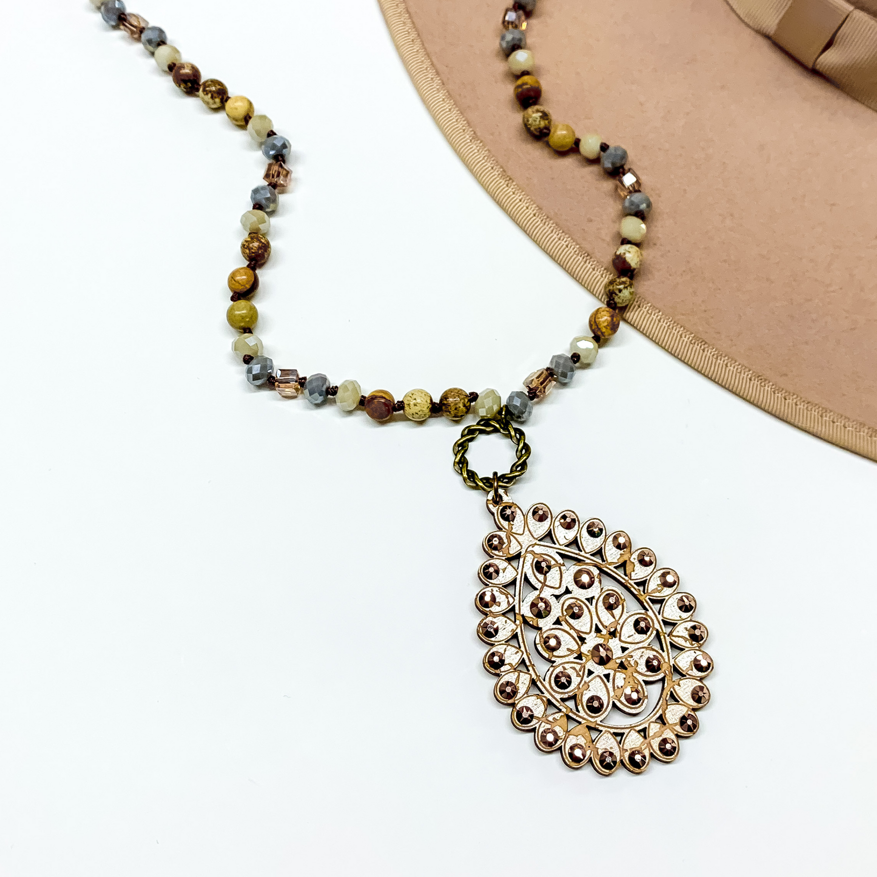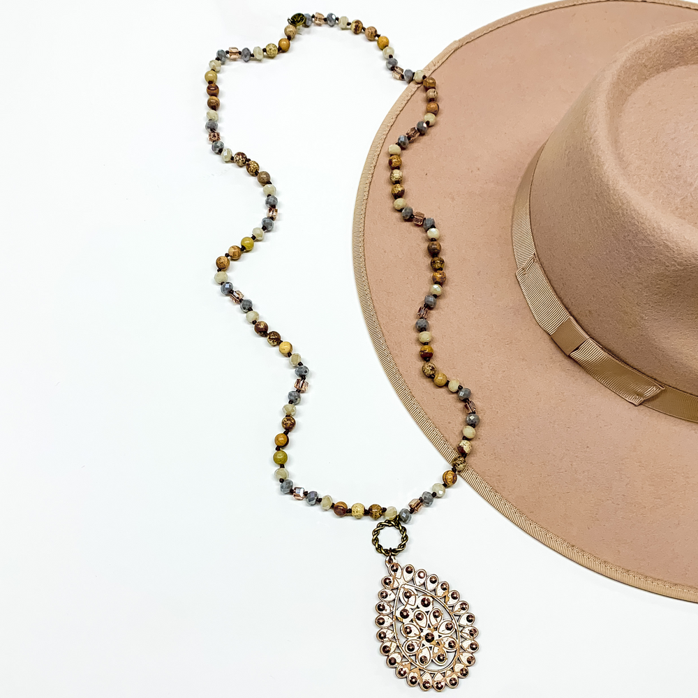 Pink Panache | Long Beaded Necklace with Santa Fe Crackle Teardrop Pendant with Rose Gold Crystal Outline