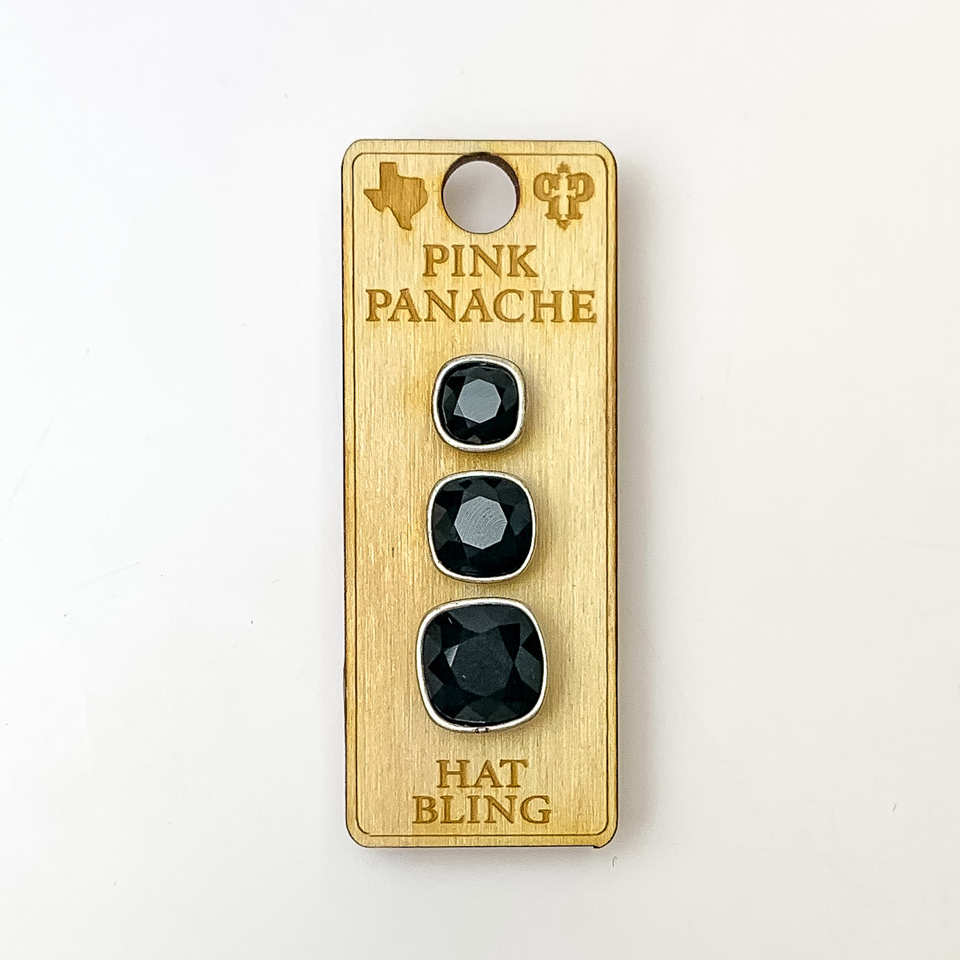 Pink Panache | Set of Three | Silver Tone 8mm, 10mm, and 12mm Hat Pins with Black Cushion Cut Crystal