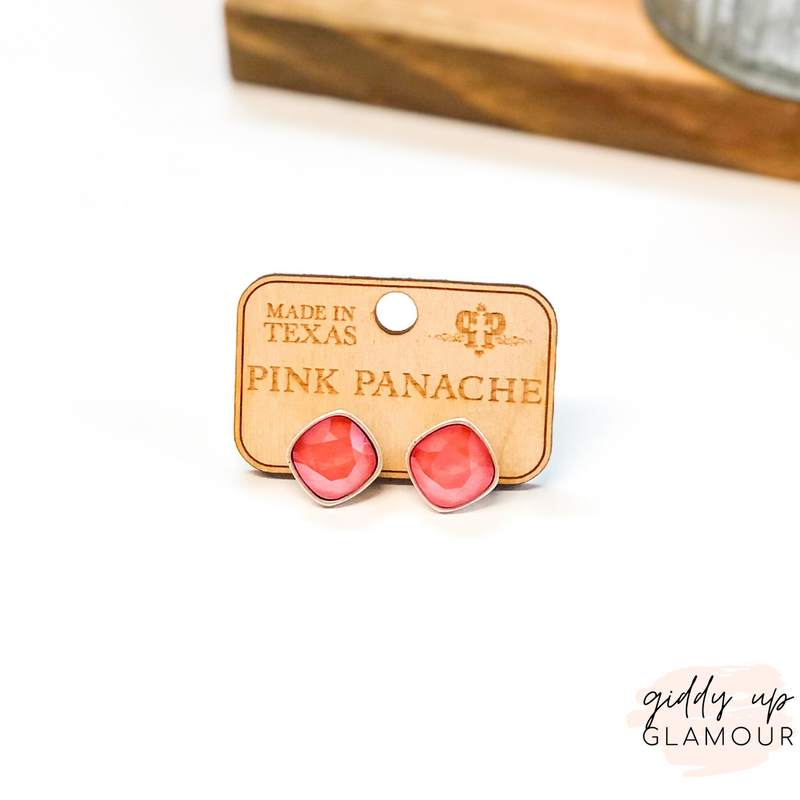 Pink Panache | Silver Stud Earrings with Cushion Cut Crystals in Candy Coral