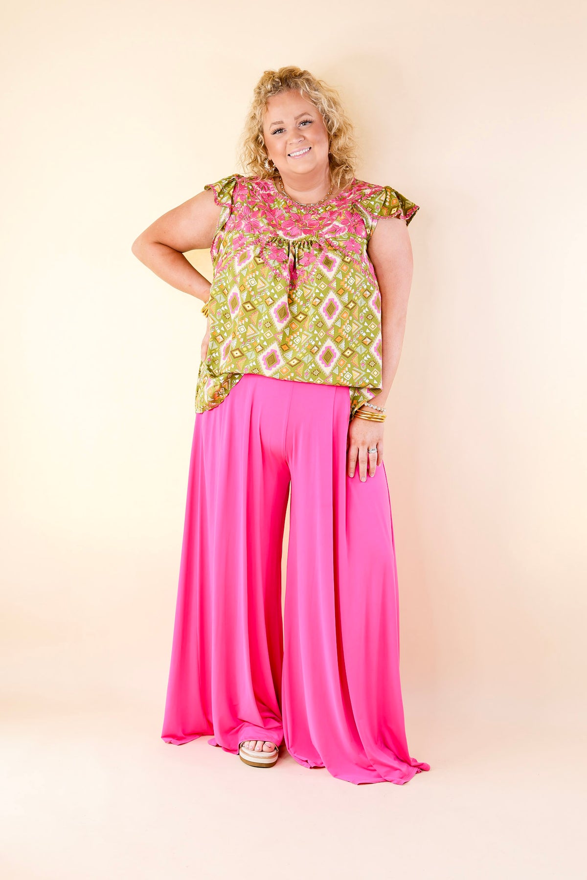 These adorable new pants are perfect for all occasions! Their super wide leg is flowy and ensures a flattering fit on all shapes and sizes! These pants include a, elastic pull-on, pleated detail on the front, a wide leg that measures 31.5 inches in diameter, and an inseam that measures 34 inches. Pair these with booties and a blazer for a fun look!