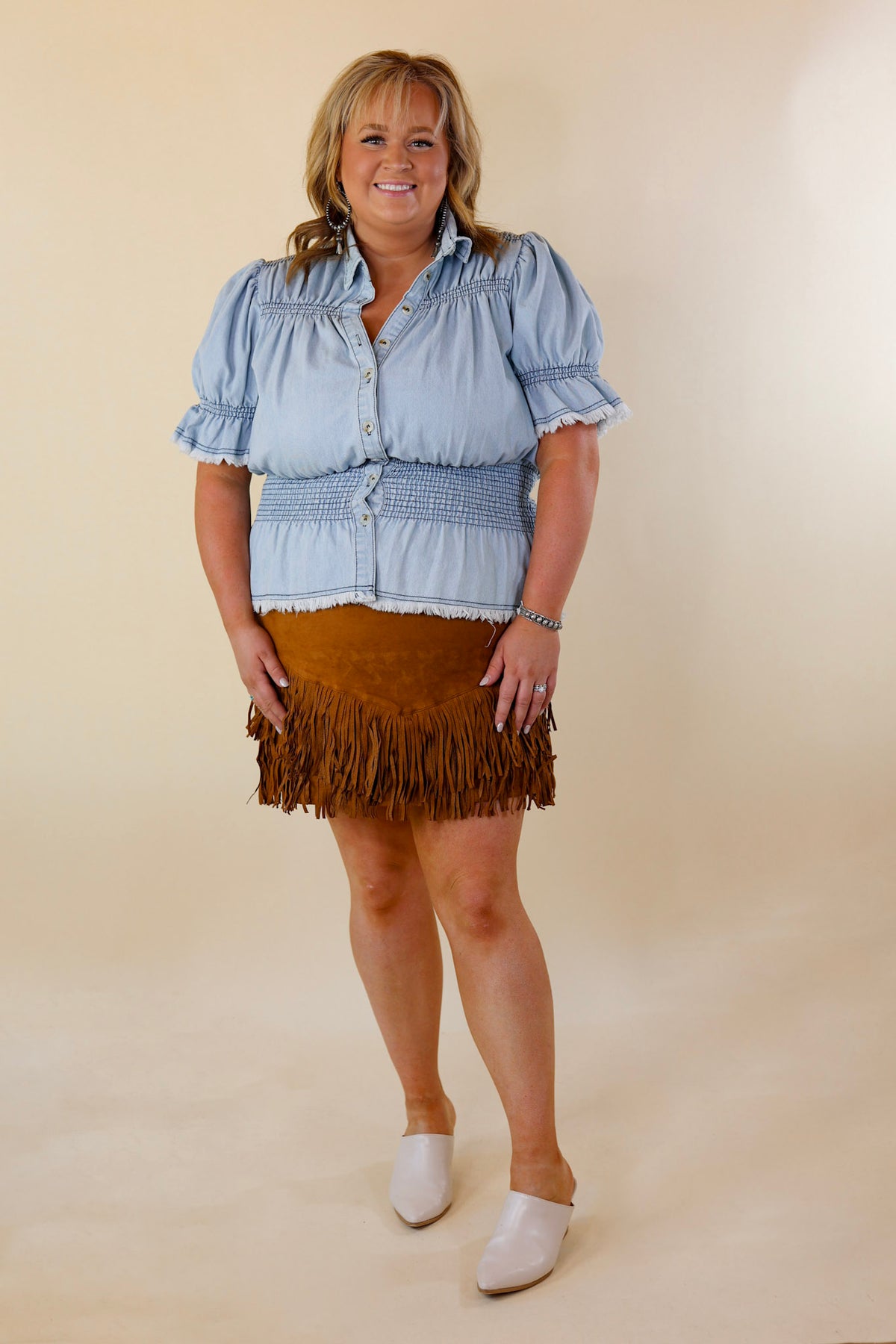 Plus Sizes | Pep Into Your Step Suede Fringe Skirt in Camel Brown