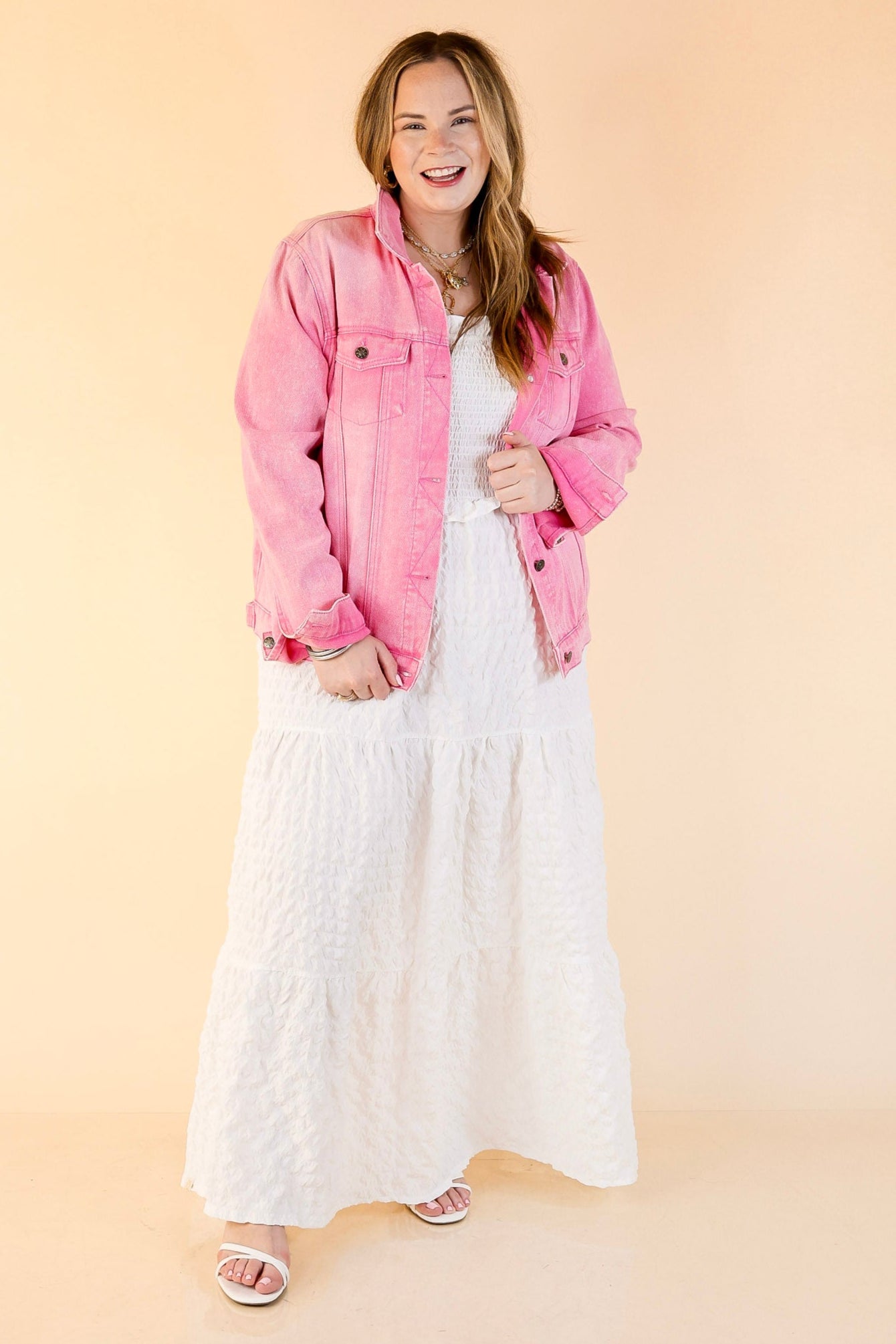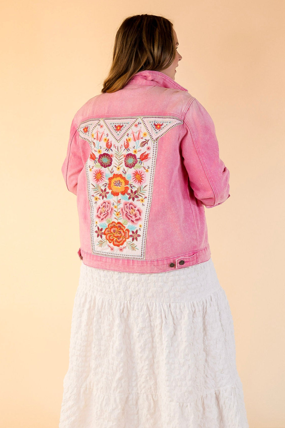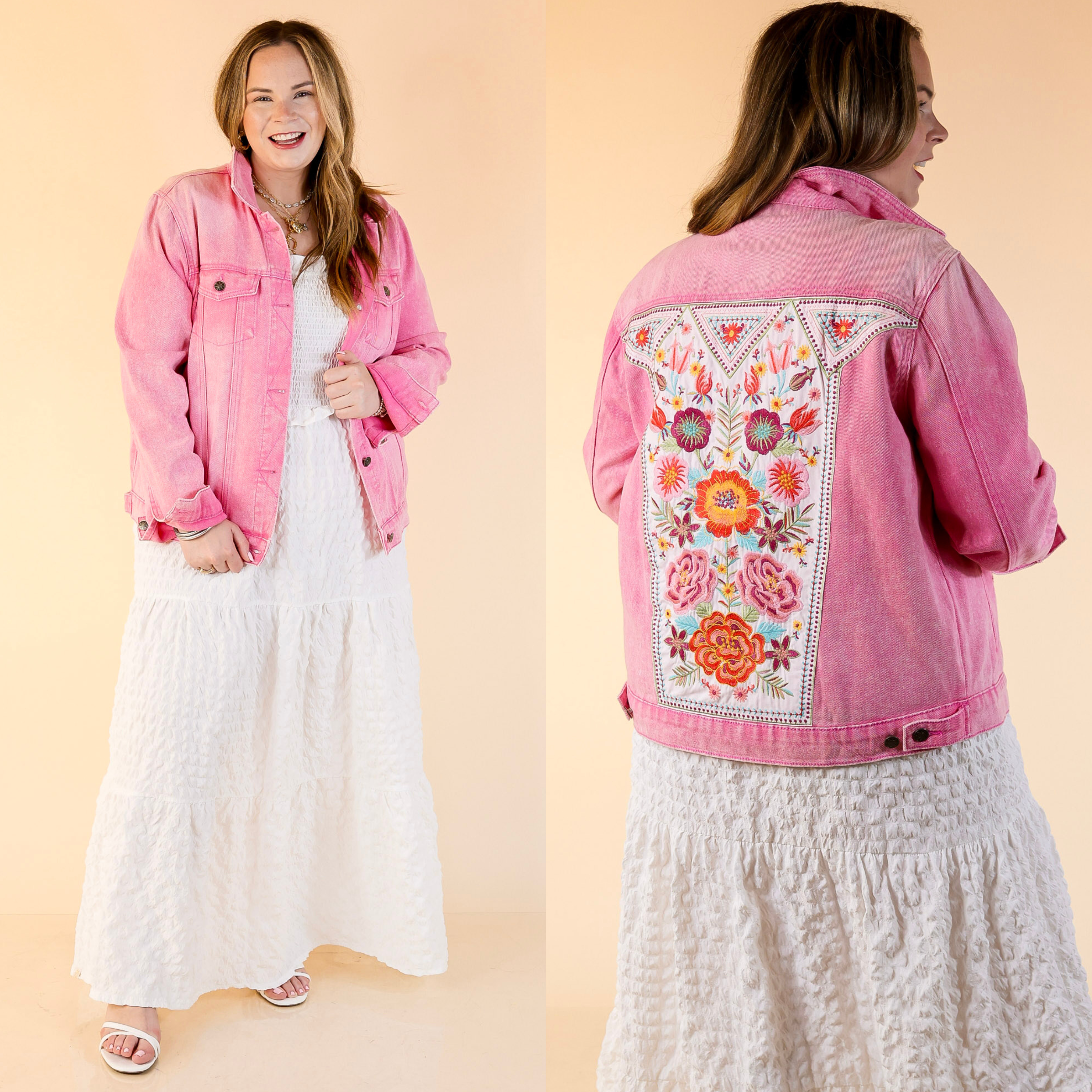 This stunning jacket is a perfect addition to any outfit! Its colorful embroidery on the back is sure to light up every look. Also features two front pockets for extra storage, a button up front and a collar. Pair this jacket with some Judy Blue jeans and black booties!