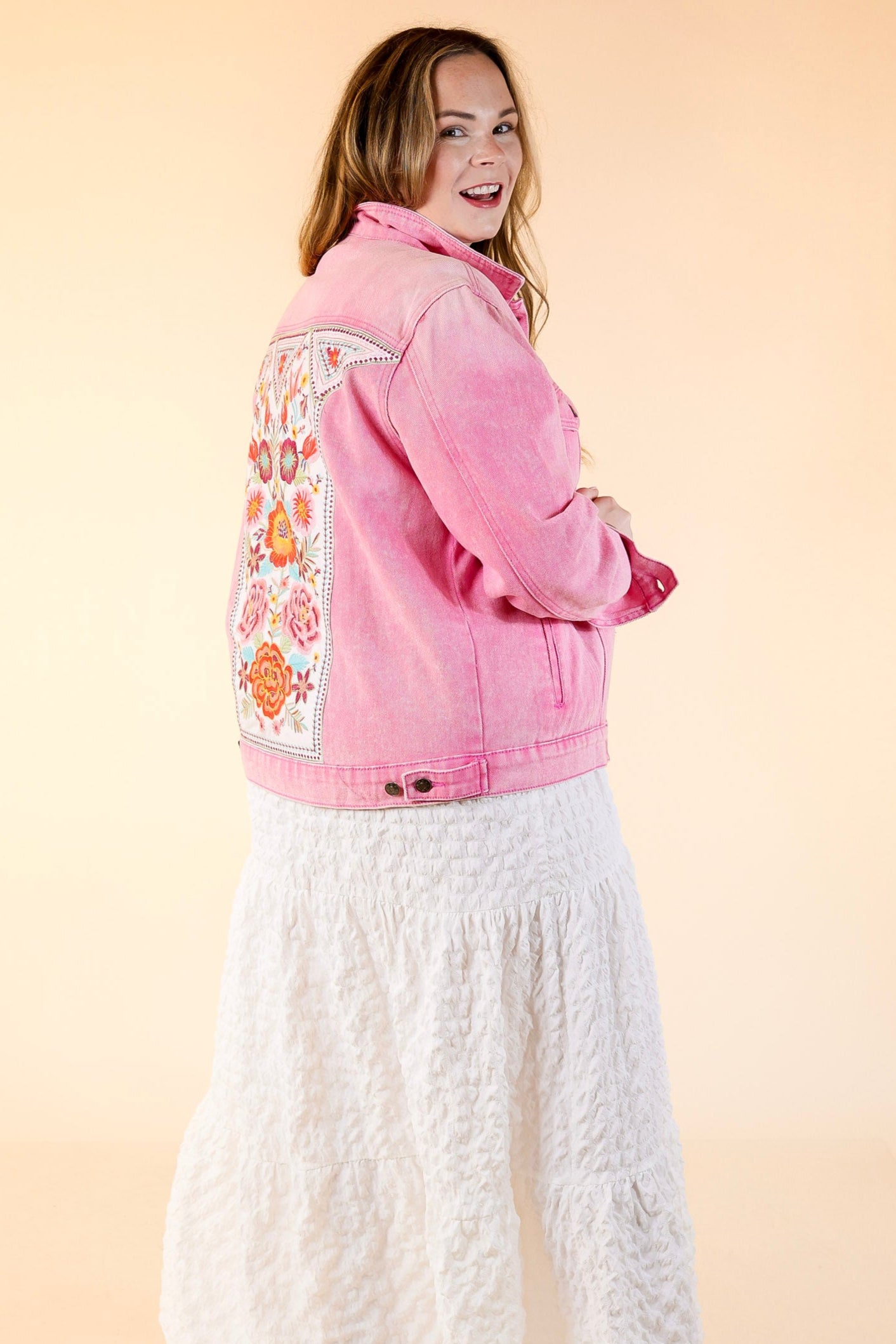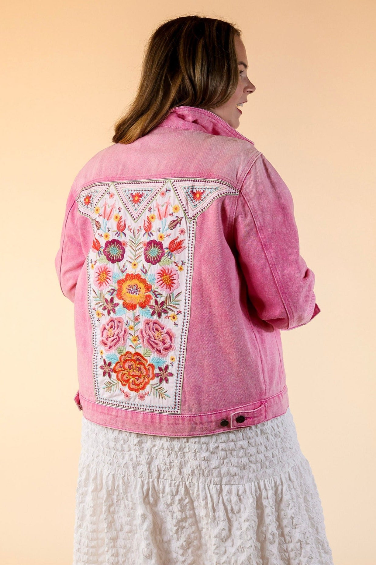 Prime Time Floral Embroidered Denim Jacket With Pockets in Pink