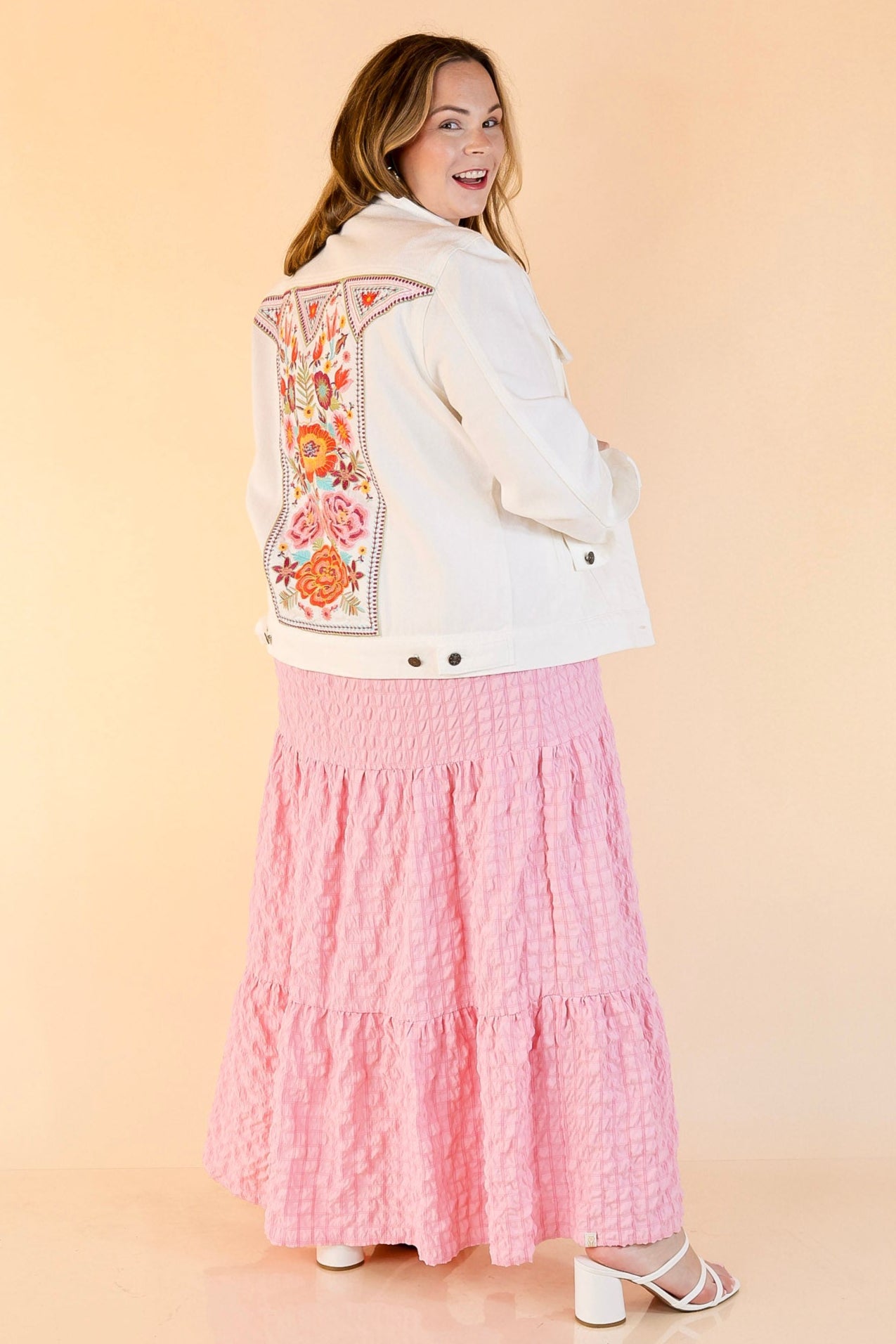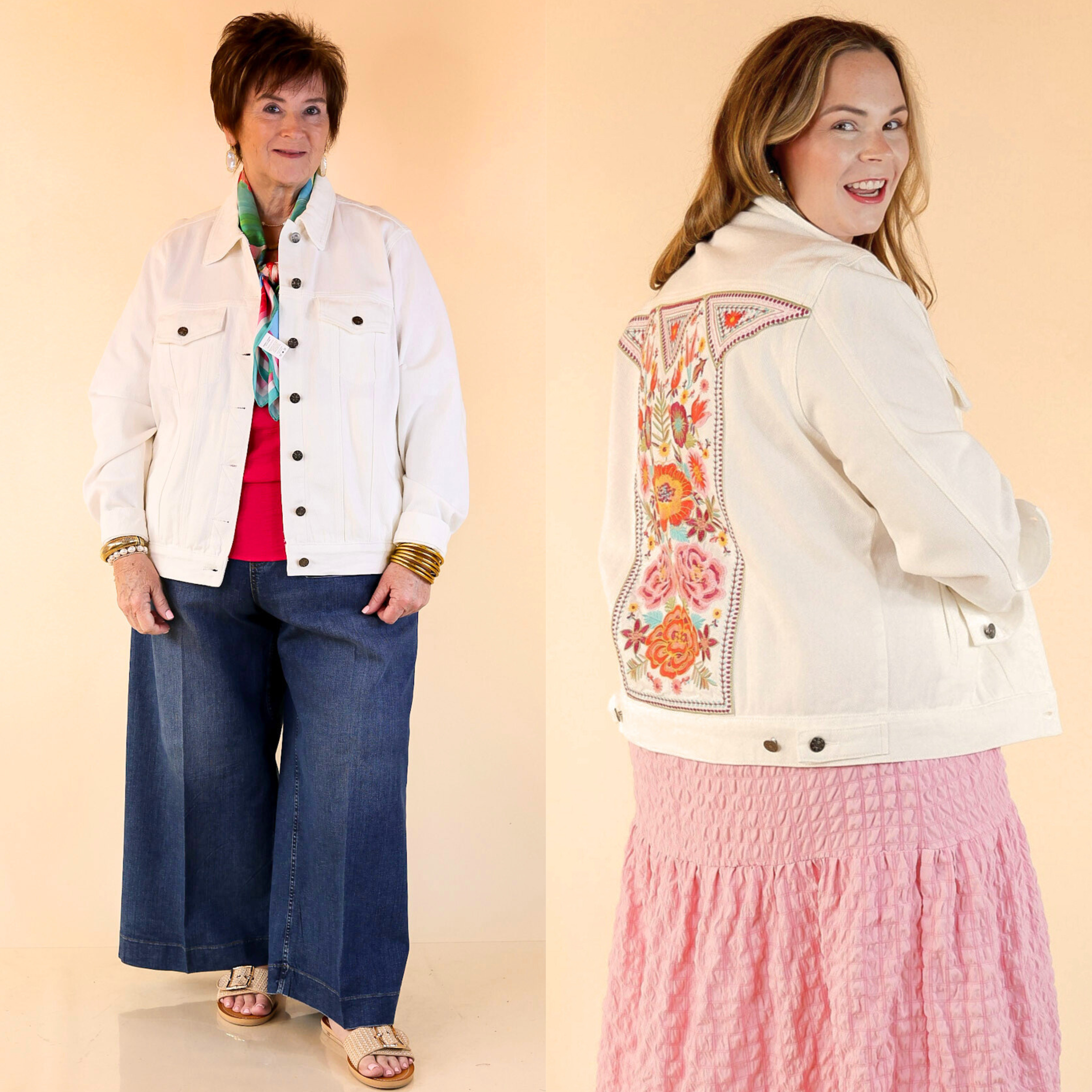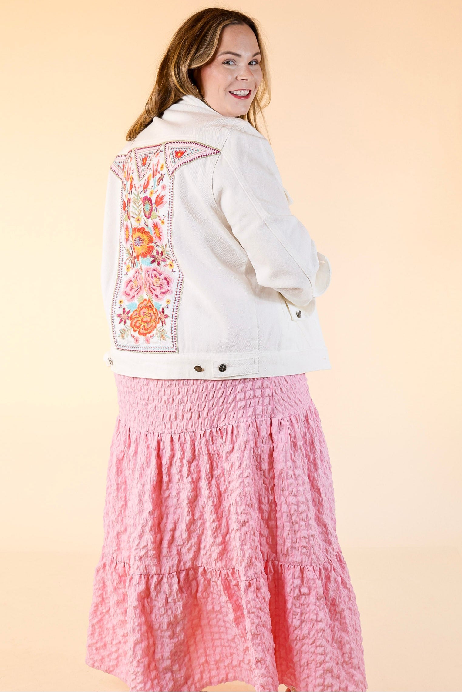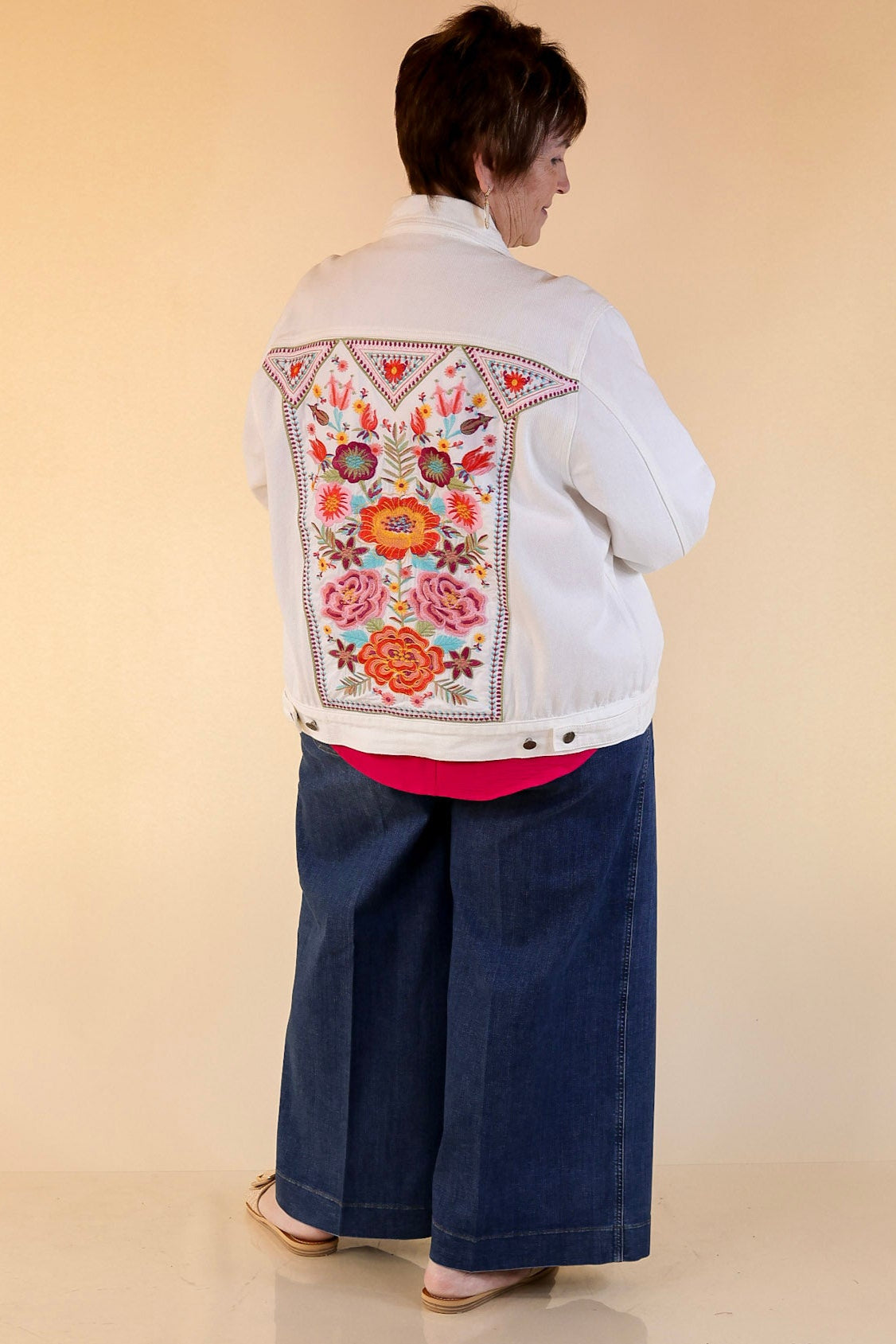 Prime Time Floral Embroidered Denim Jacket With Pockets in White