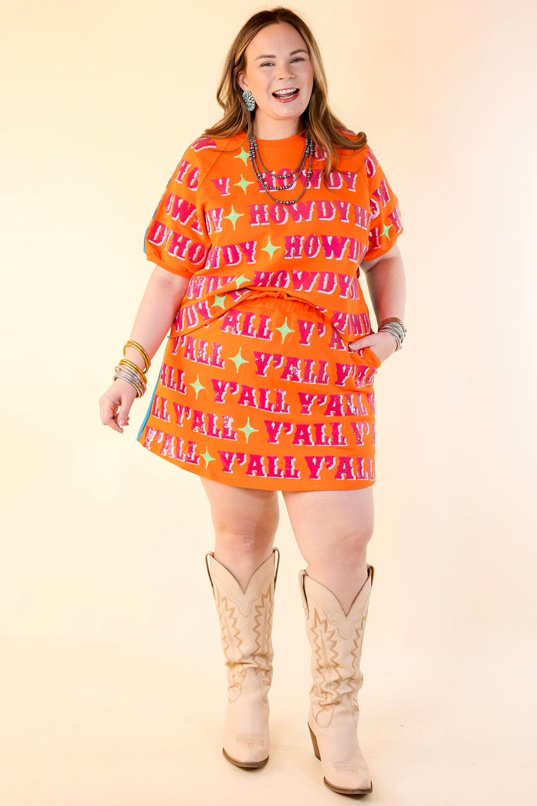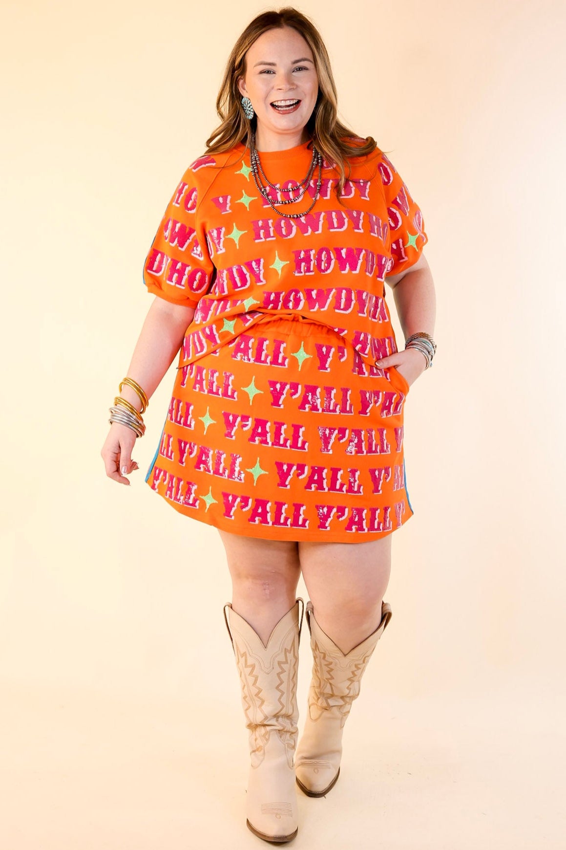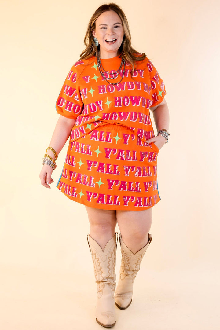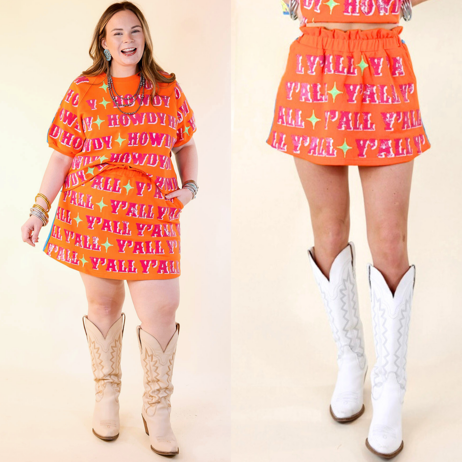 Achieve party-perfect looks with the Queen Of Sparkles ‘Howdy Y’all’ colorblock sequin skort. Featuring a two-piece set, this statement skort ensures you'll shine at any occasion. Add some sparkle to your wardrobe today!
