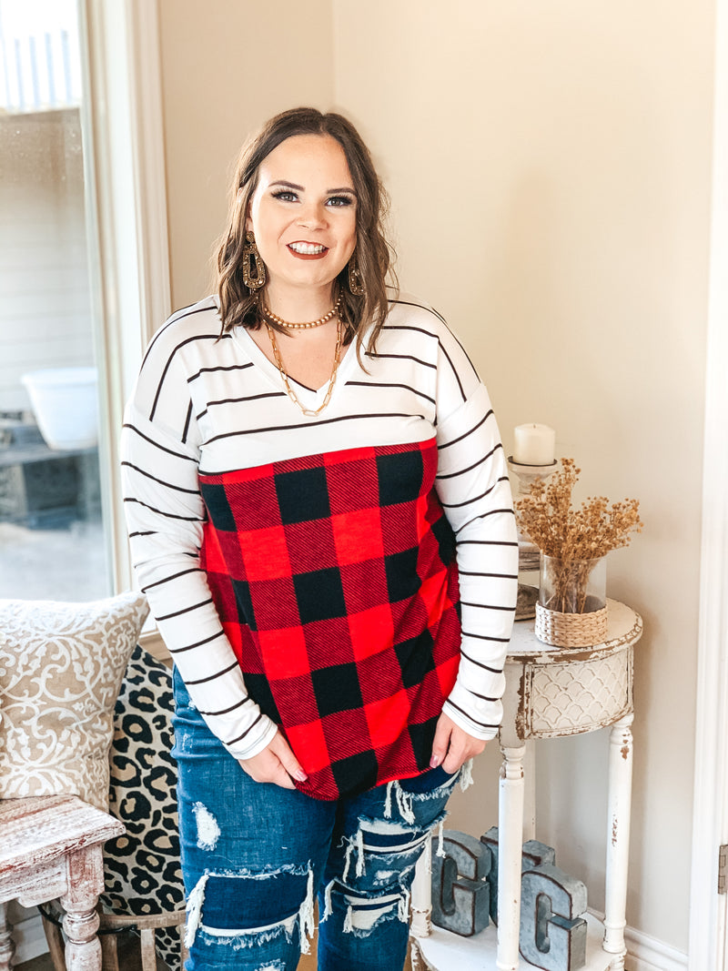 Sights of the Season Long Sleeve V Neck Top with Striped Upper and Buffalo Plaid Body