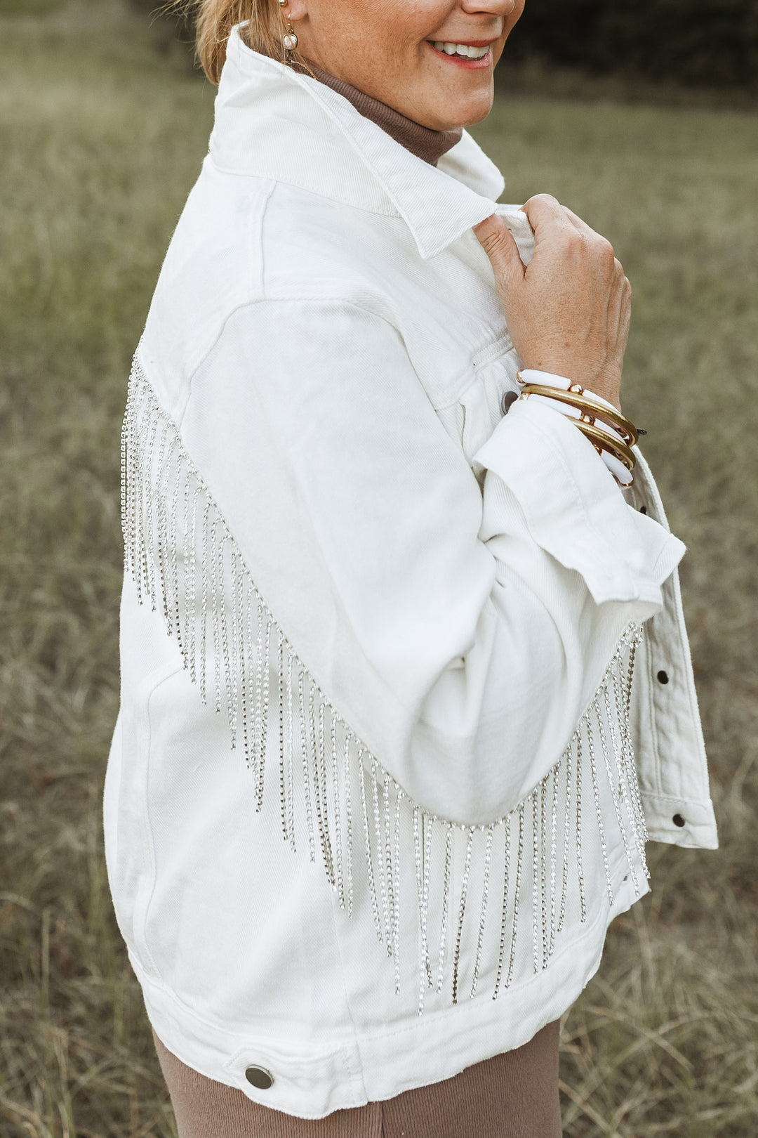 Rhinestone Cowgirl Crystal Fringe Denim Jacket in White - Giddy Up Glamour Boutique