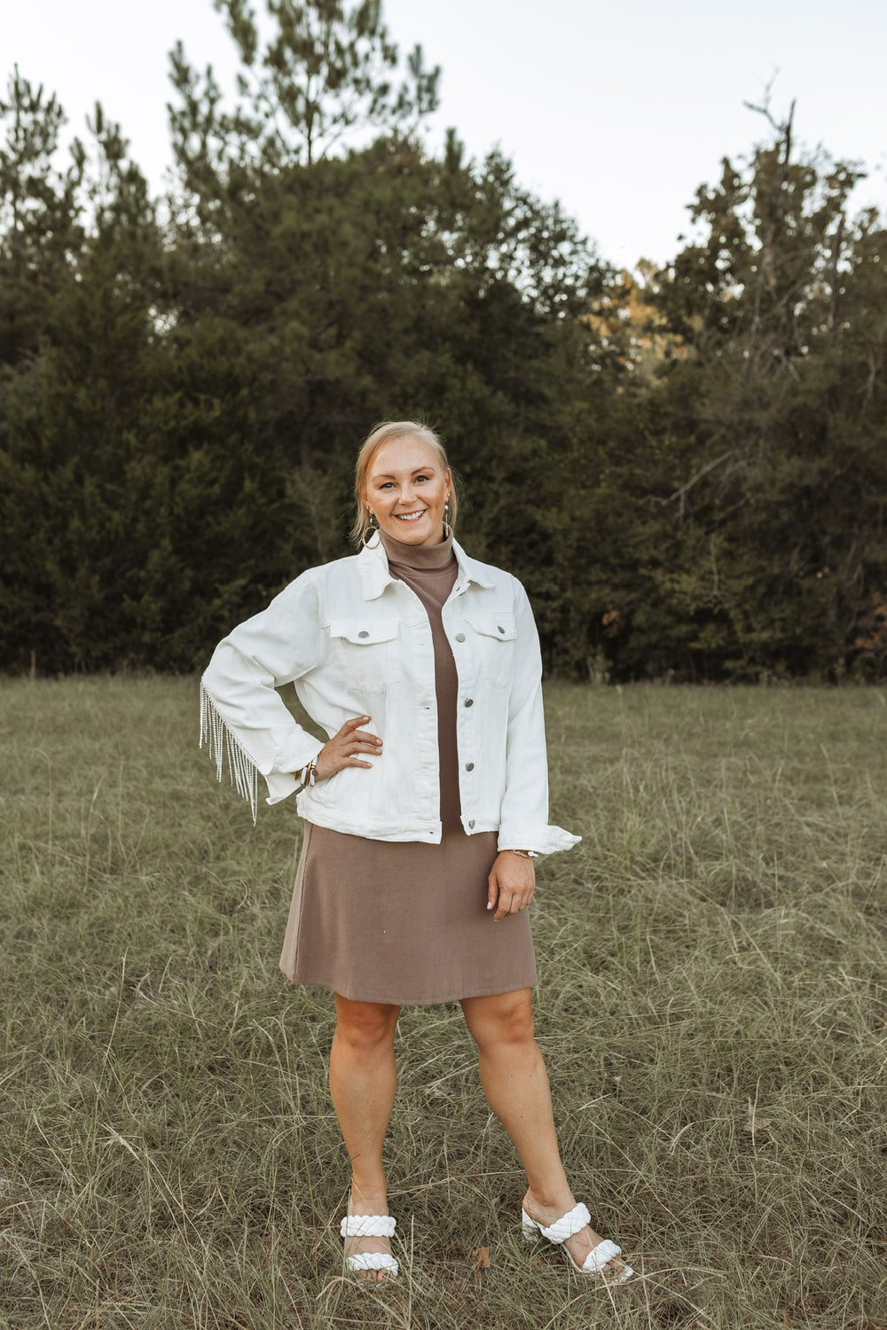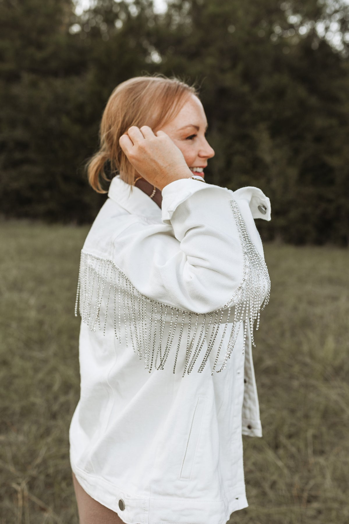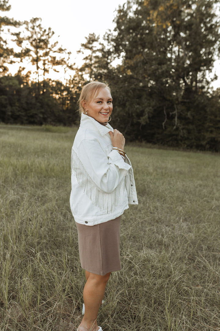 Mallory is pictured here modeling our new white denim jacket with a collared neckline, button up front, and front pockets that button. The jacket features a line of crystal fringe across the back of the arms and the back of the jacket. Mallory is modeling this jacket with our "One Love" tank sweater dress with turtle neck in taupe underneath along with gold jewelry and white, braided heels.