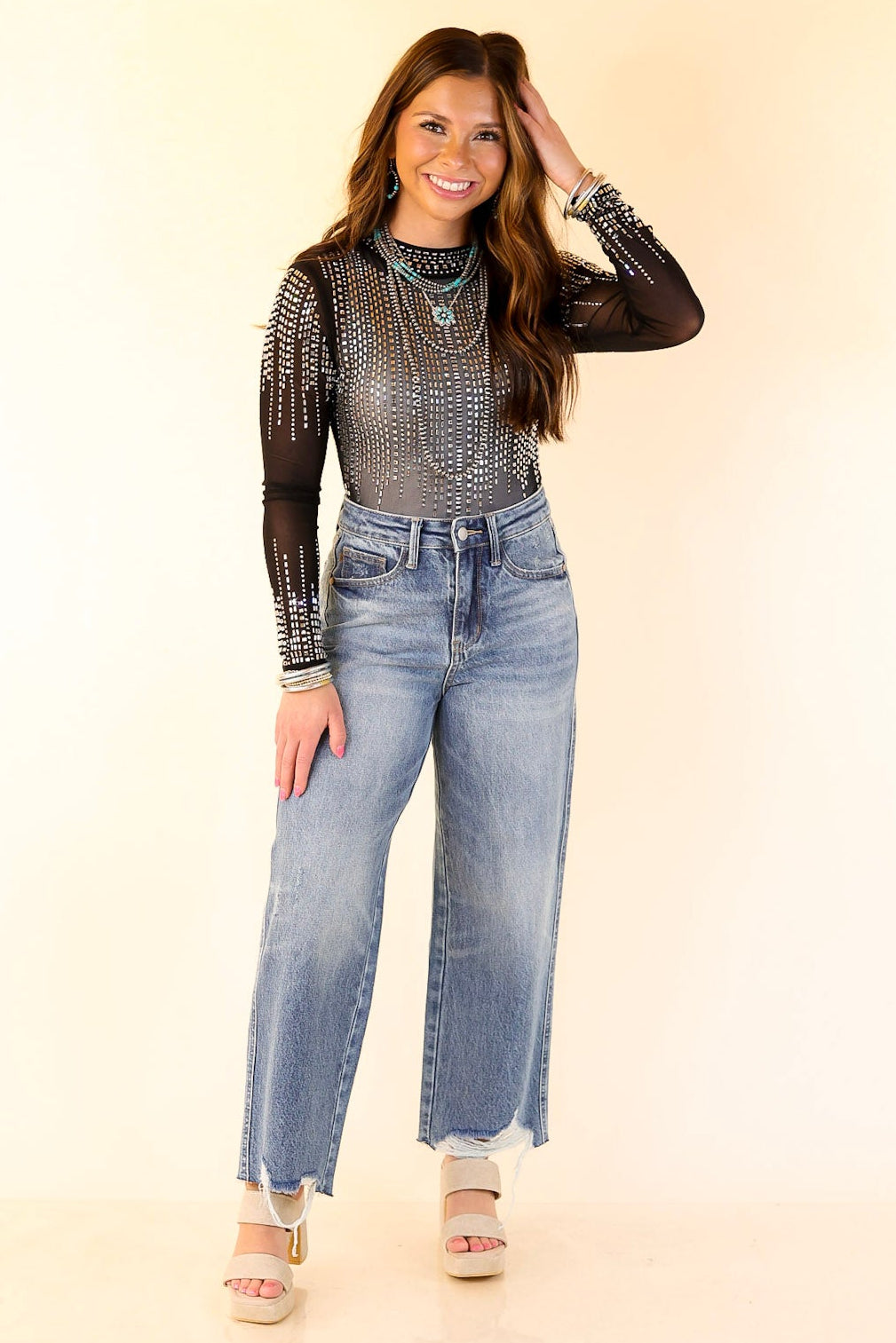 Rhinestone Rodeo Long Sleeve Rhinestone Mesh Bodysuit in Black