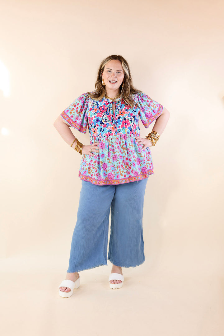 Right On Cue Elastic Waistband Cropped Pants with Frayed Hem in Light Blue
