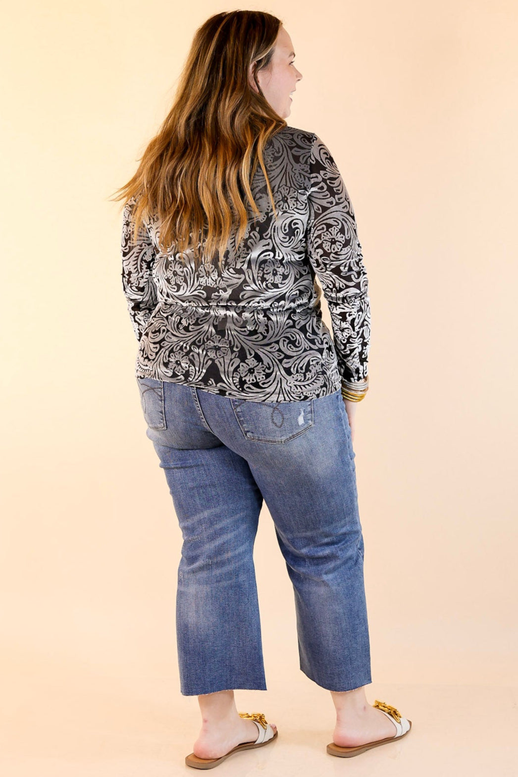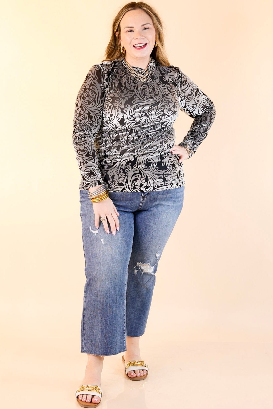 Rodeo Drive Tooled Leather Print Mesh Long Sleeve Top in Black and Silver
