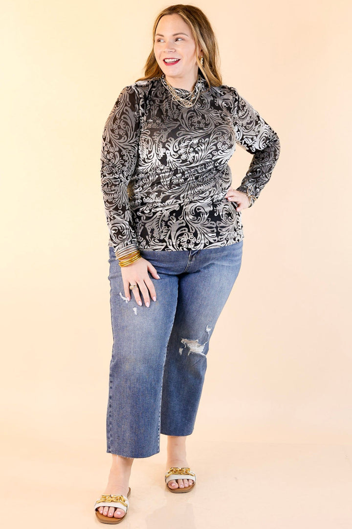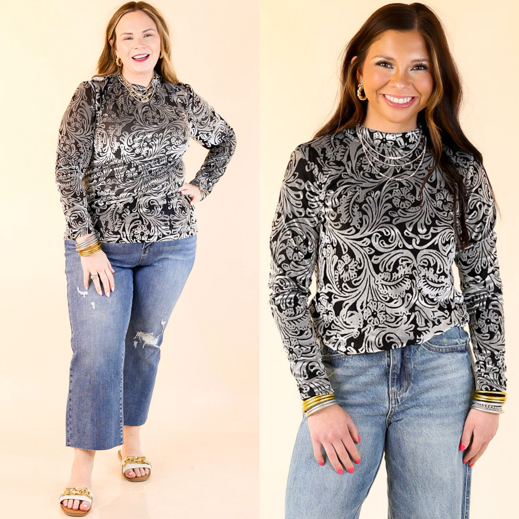 Saddle up in style with our Rodeo Drive top ā a head-turning mesh long sleeve that blends western flair with high-end edge. This sheer stunner features a black background with an allover tooled leather print in luxe silver velvet, giving it the perfect mix of texture and shine. The fitted silhouette and mock neck add a sleek, elevated touch thatās perfect for layering or wearing solo.