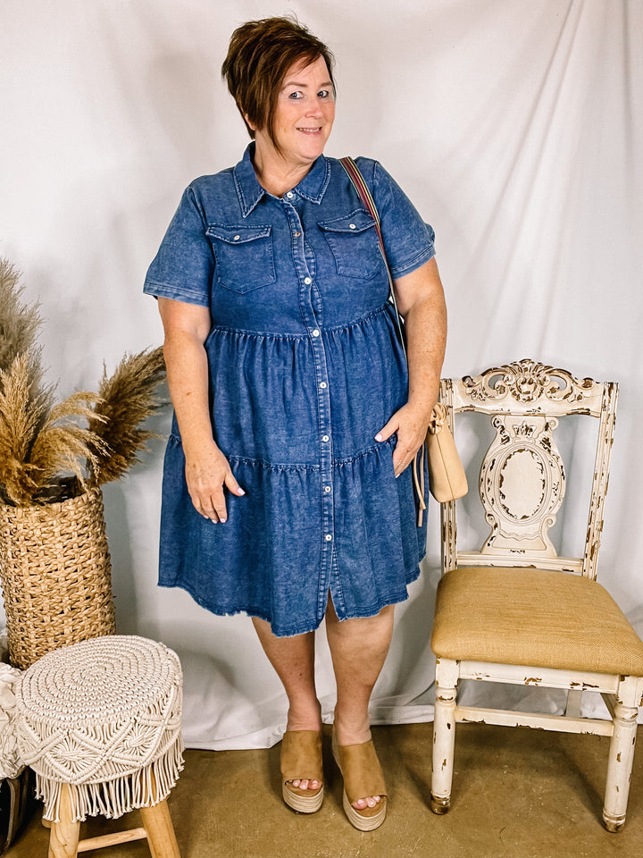 After searching everywhere, this body style is still the the one! This adorable dress includes a button up front, collared neckline, front pockets, a ruffle tiered skirt, and short sleeves. Pair this denim chambray dress with boots and a hat and you'll be set! Nancy is wearing a size 2XL.