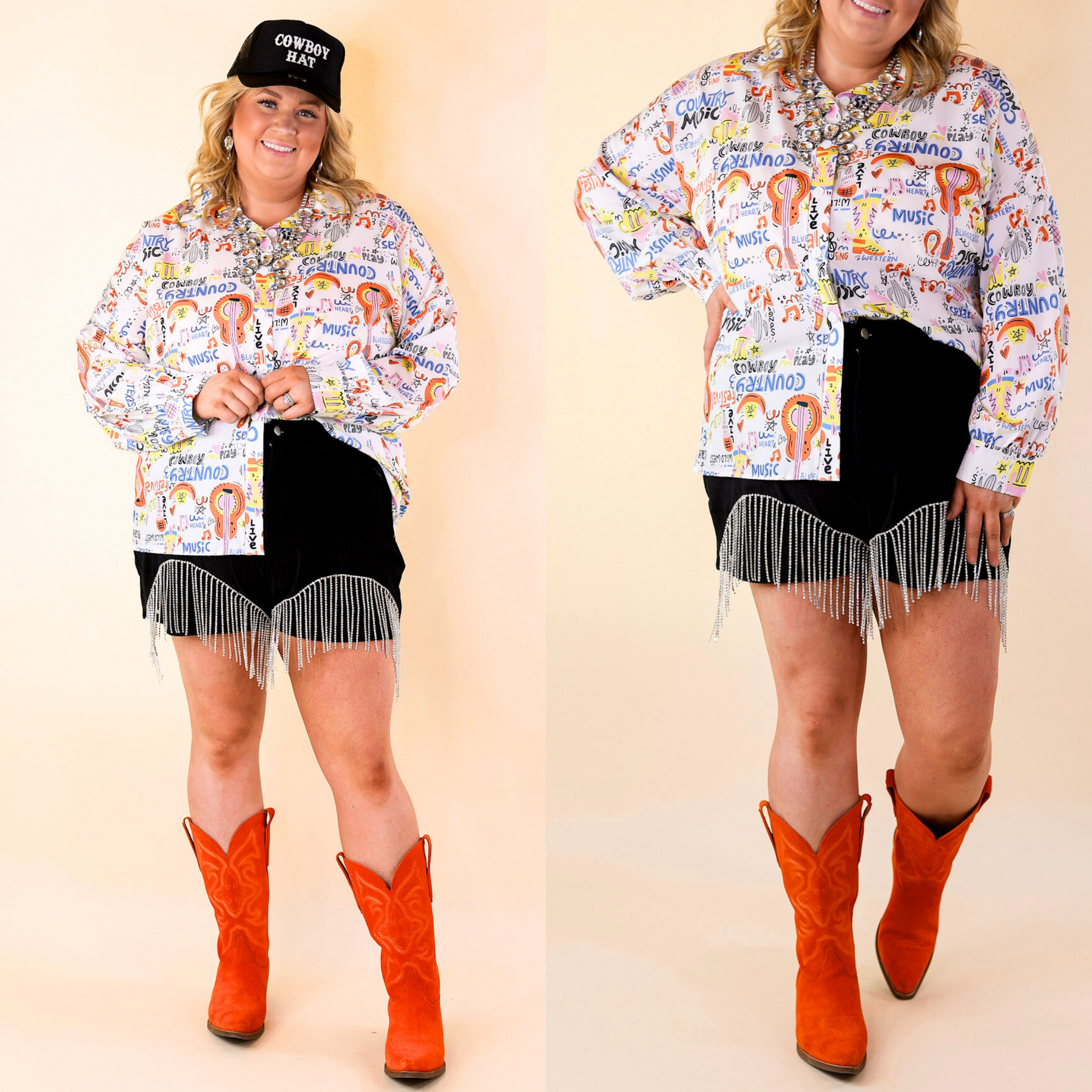 Saddle up and get ready rock these adorable new shorts! They include a crystal fringe across the thighs, and a corduroy body. Pair these with boots and a bodysuit and you'll be a ready to saddle up, babe!