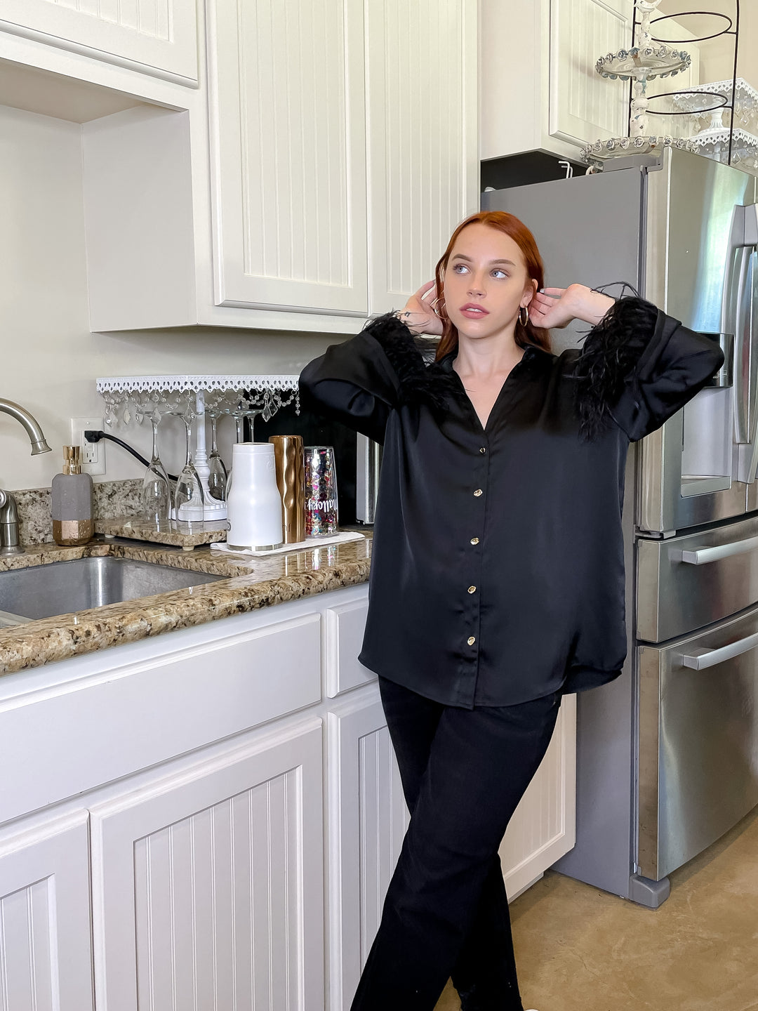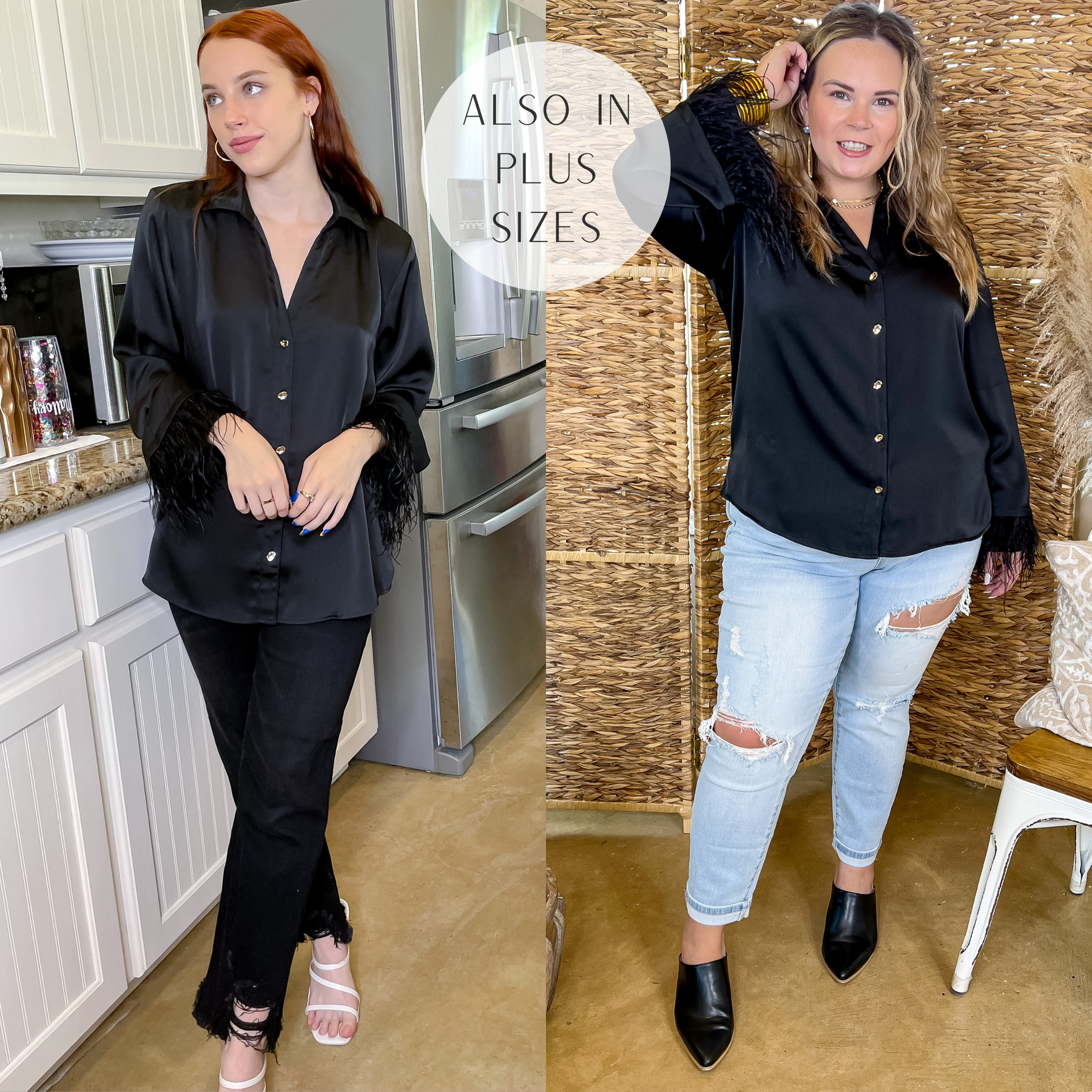 Take a Chance Satin Button Up Top with Feather Trim Long Sleeves in Black