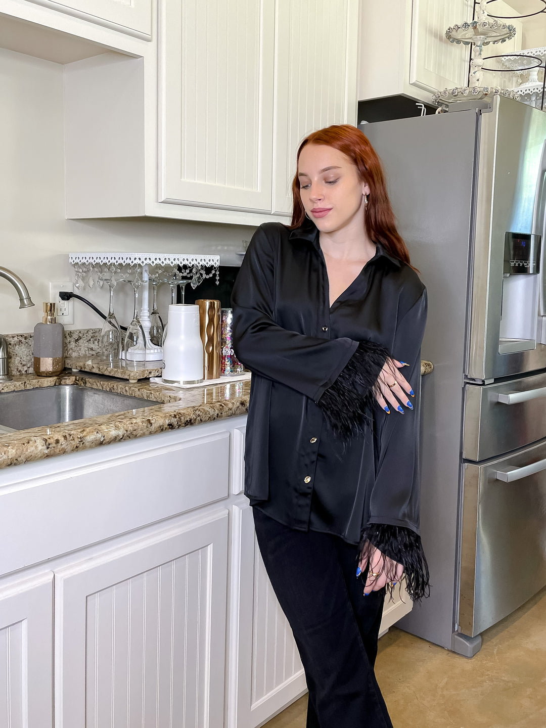 Model is wearing a black button up with long sleeves that have feathers around the wrist, and gold buttons. Size small model has this paired with white heels, black jeans, and gold jewelry. Size large model has this paired with boyfriend jeans, black mules, and gold jewelry.