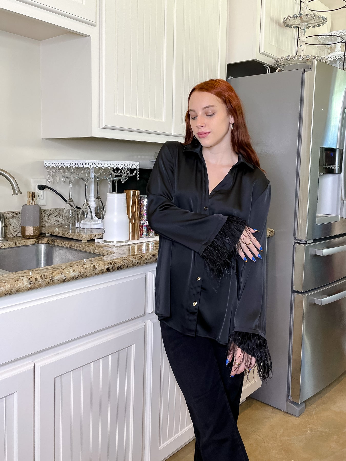 Take a Chance Satin Button Up Top with Feather Trim Long Sleeves in Black - Giddy Up Glamour Boutique