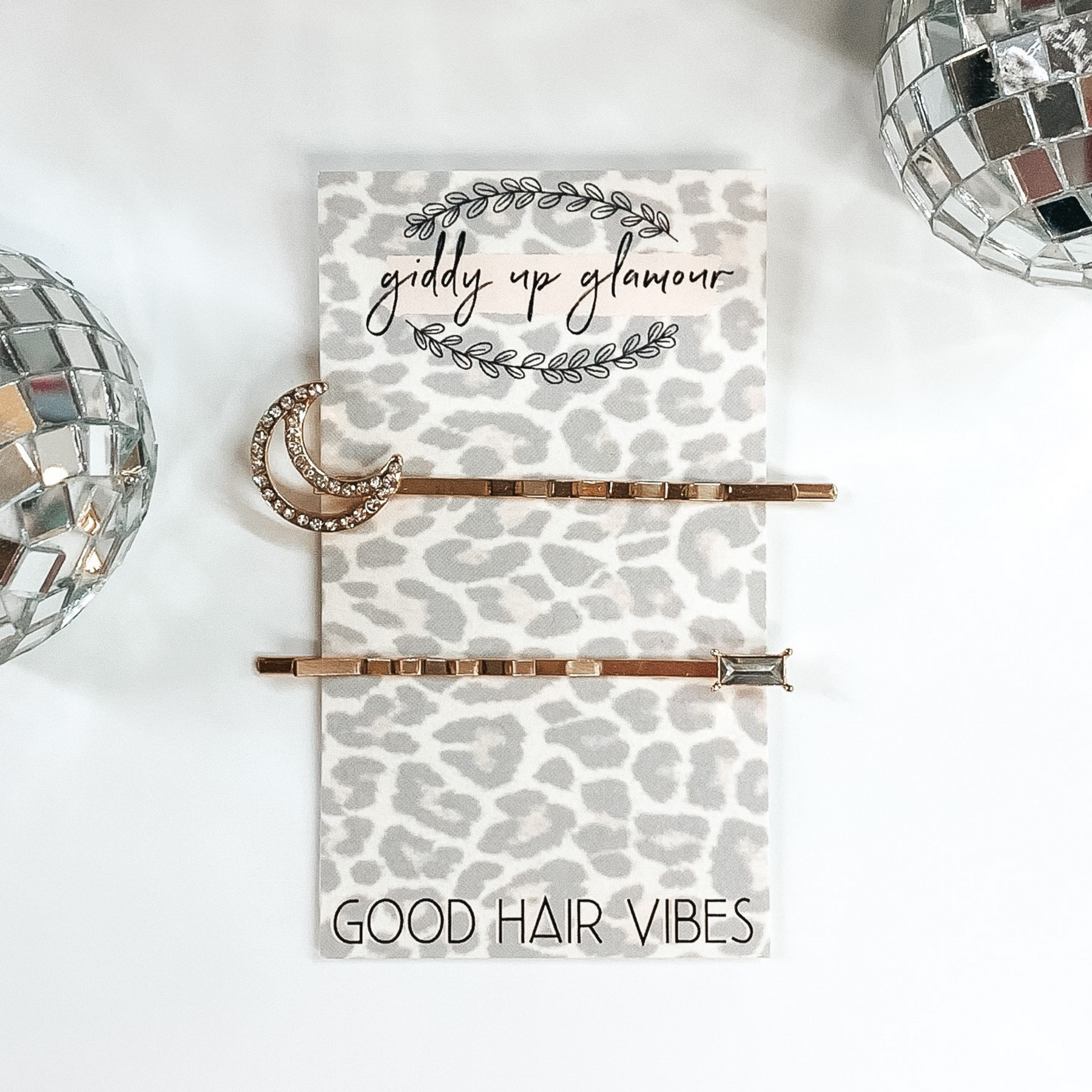 Set of Two | Crystal Moon and Small Baguette Hair Pin in Gold