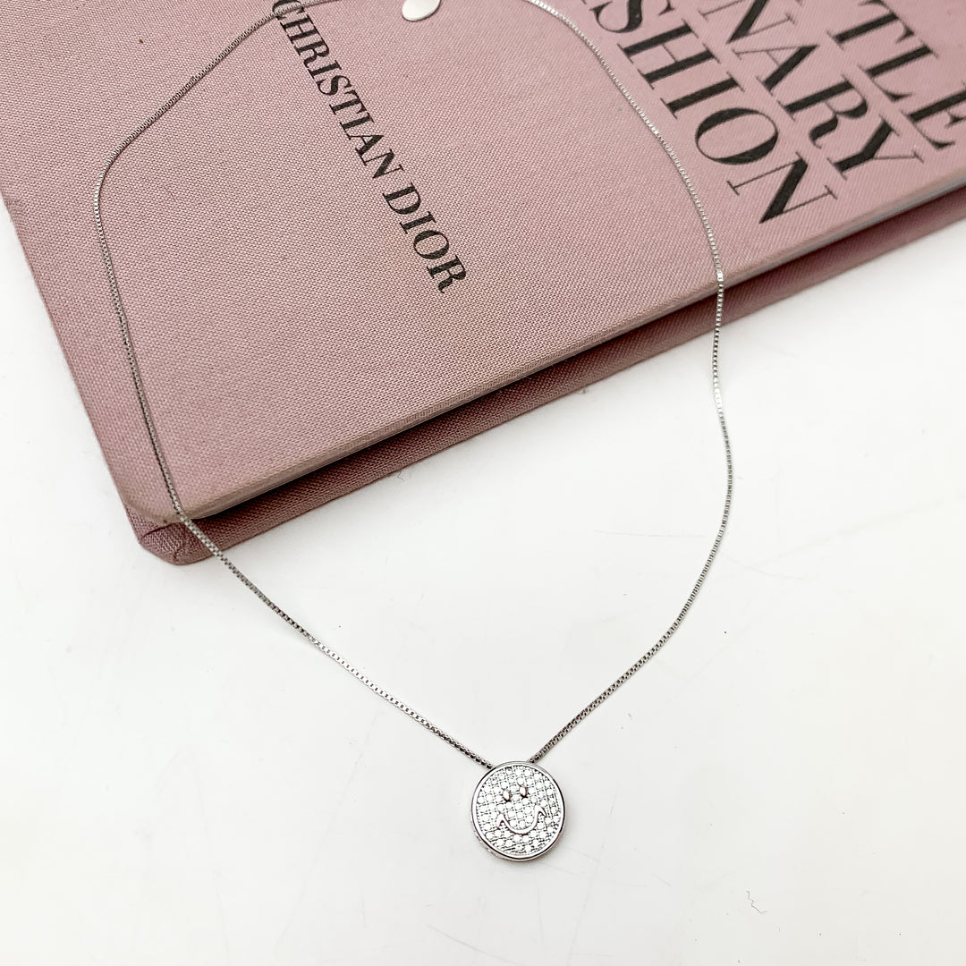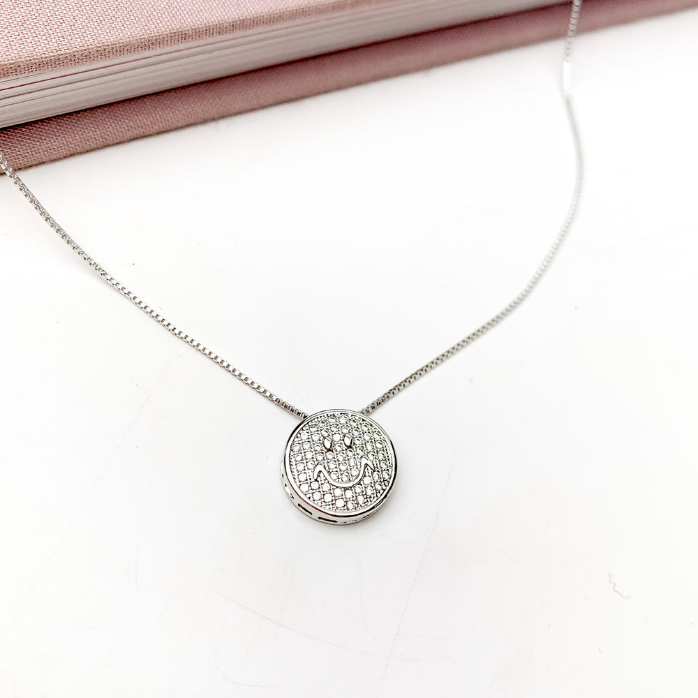 Silver Tone Chain Necklace With Clear Crystal Smiley Face