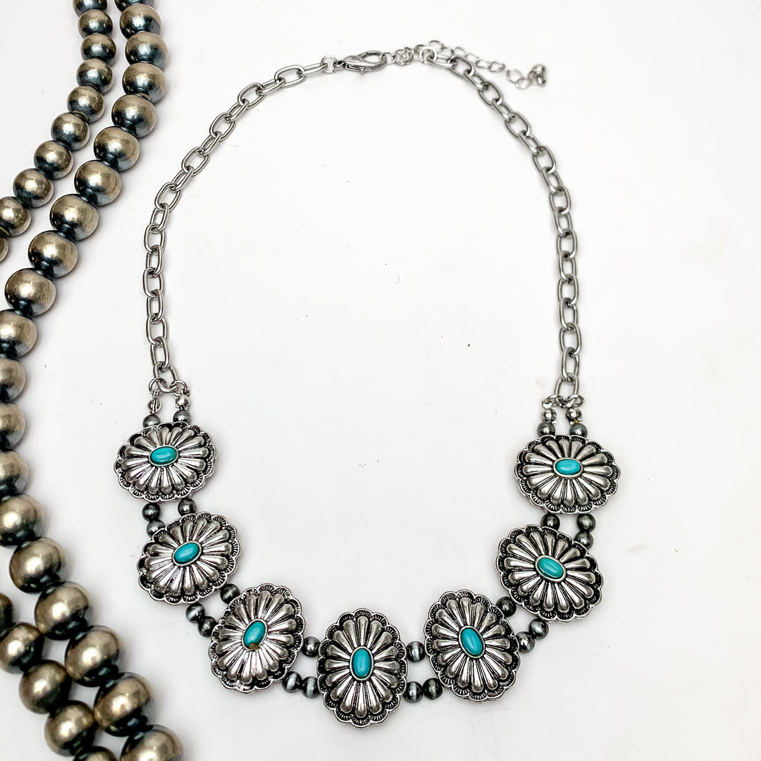 Silver Tone Flower Concho Necklace With Turquoise Blue Stones