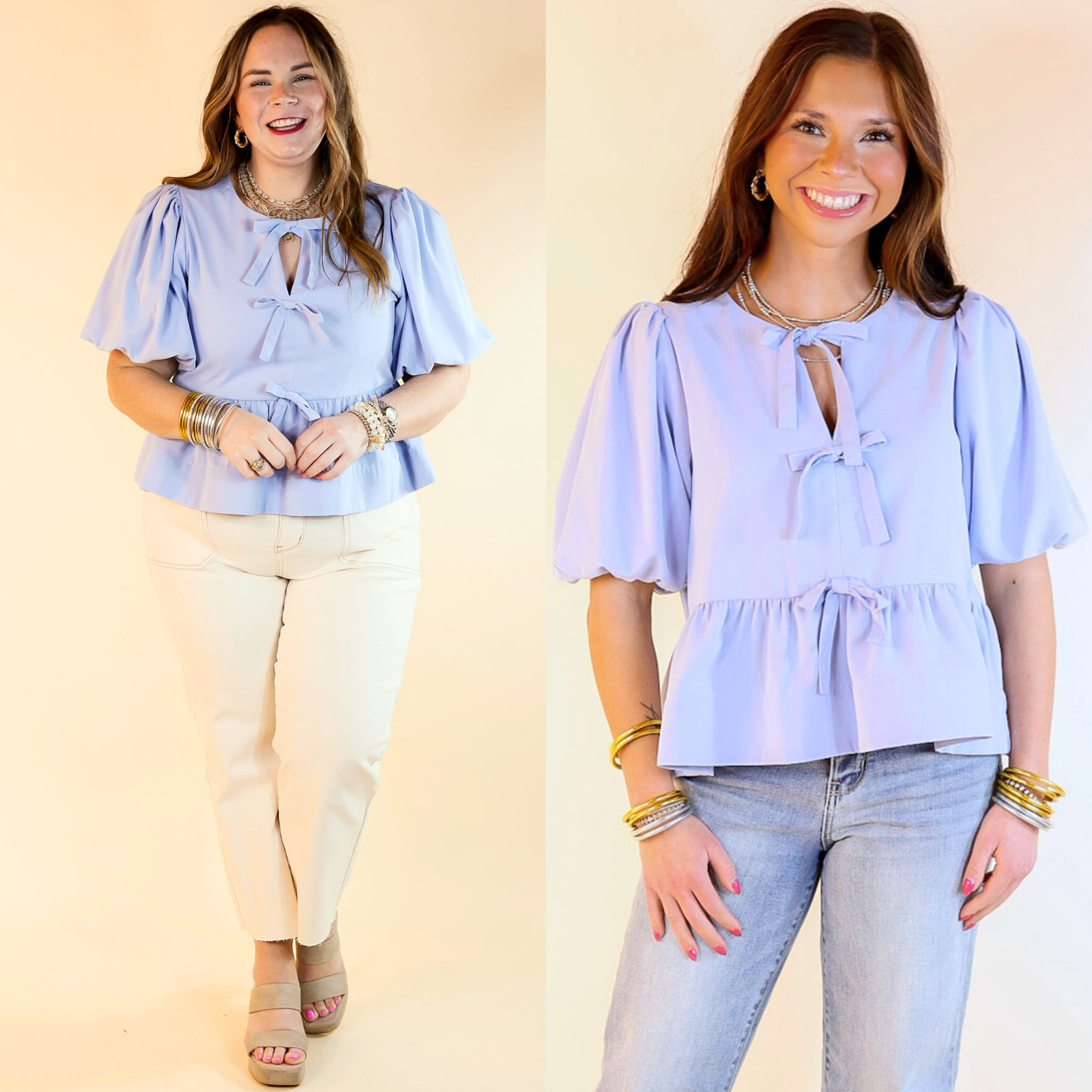 Elevate your wardrobe with the Simply Stunning Top, a chic and versatile piece that’s perfect for any occasion. This top features delicate bow tie detailing across the front, adding a playful yet refined touch. The short puff sleeves bring a trendy and feminine flair, while the one ruffle tier creates an effortlessly flattering silhouette.