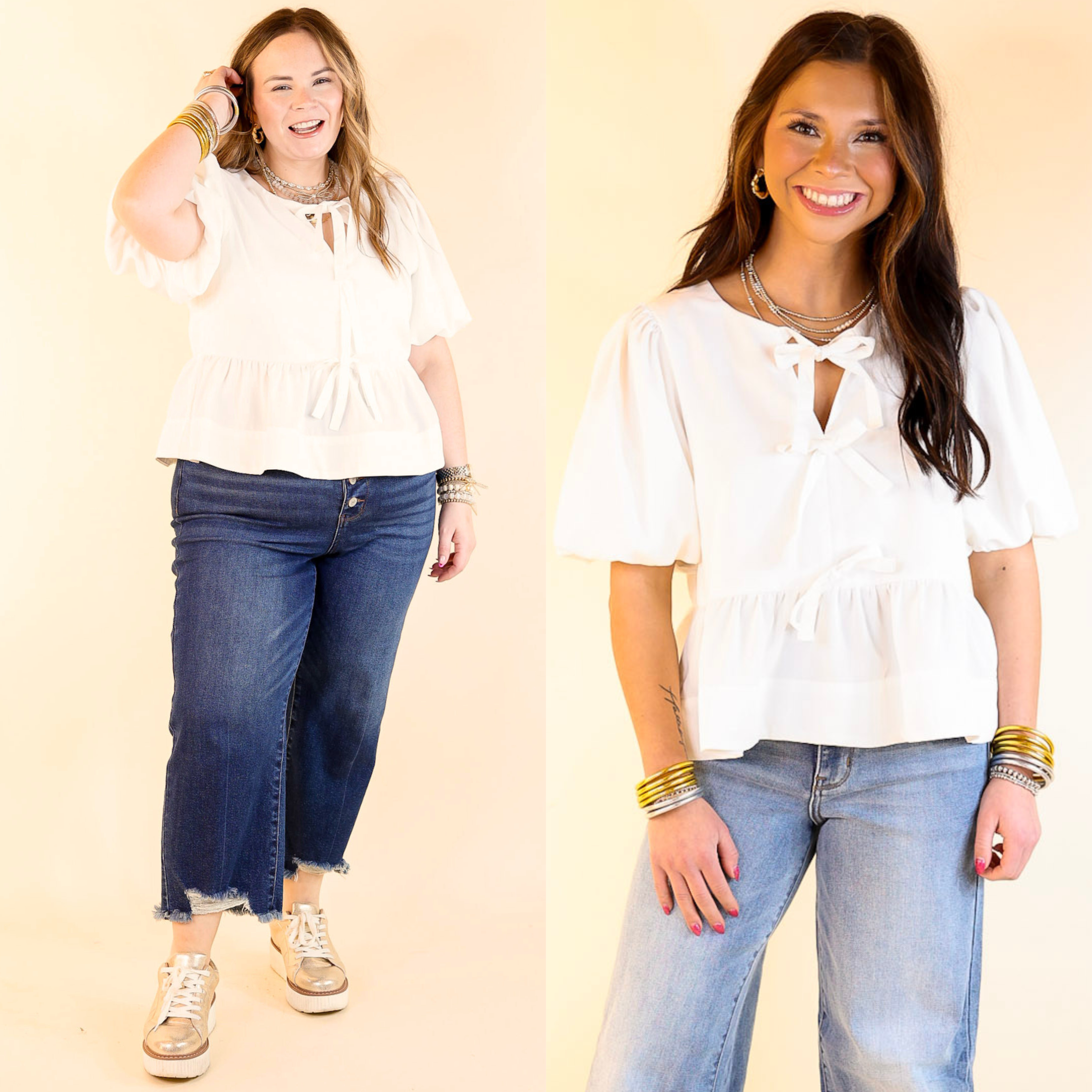 Simply Stunning Short Puff Sleeve Top with Bow Tie Detailing in Off White