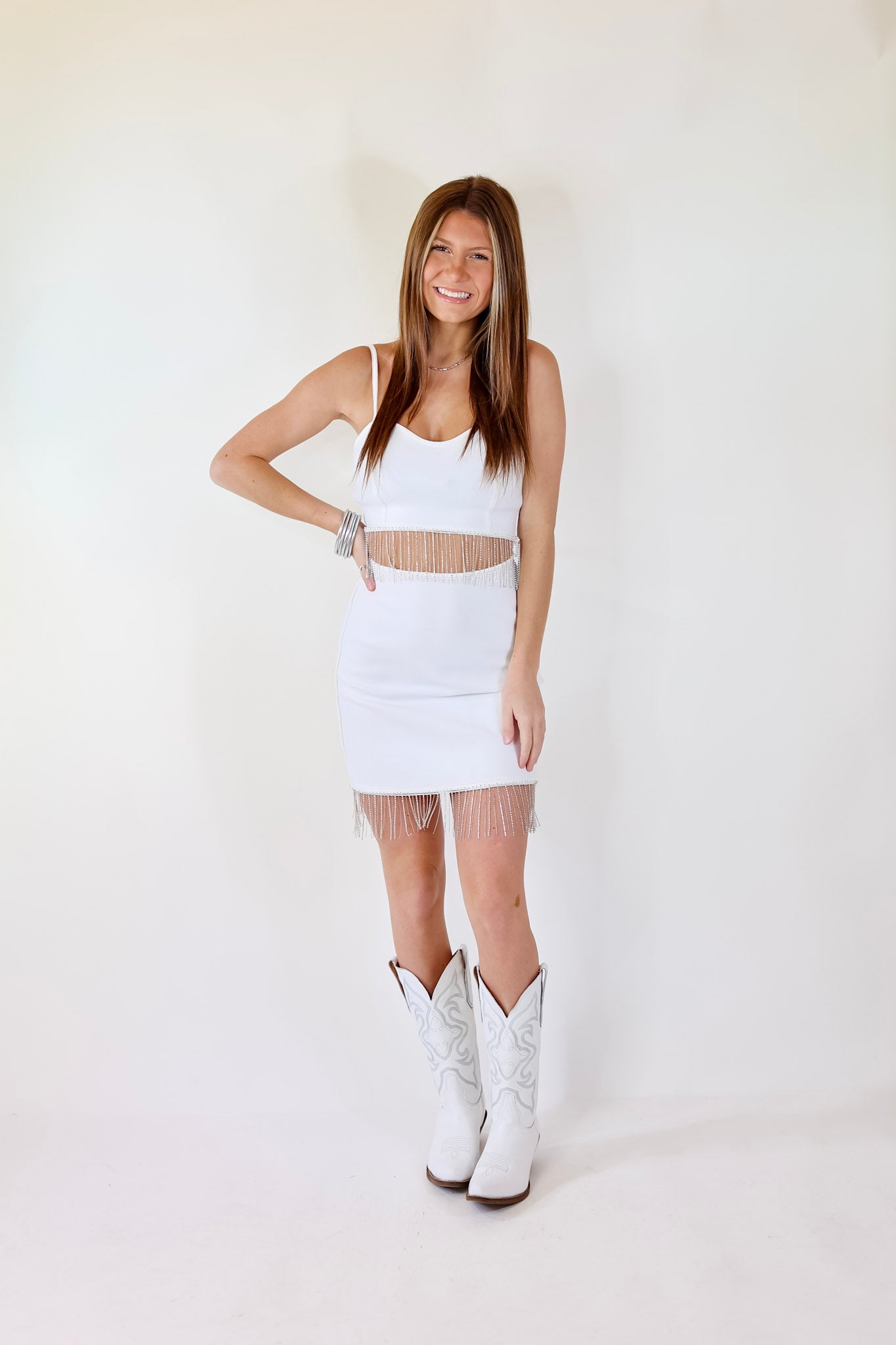 You're sure to make the VIP list in this adorable new skirt! It includes a zip up back, a fitted body, and silver crystal fringe along the hem. Make sure to grab the matching top for a stunning look! Arté is wearing a size small.