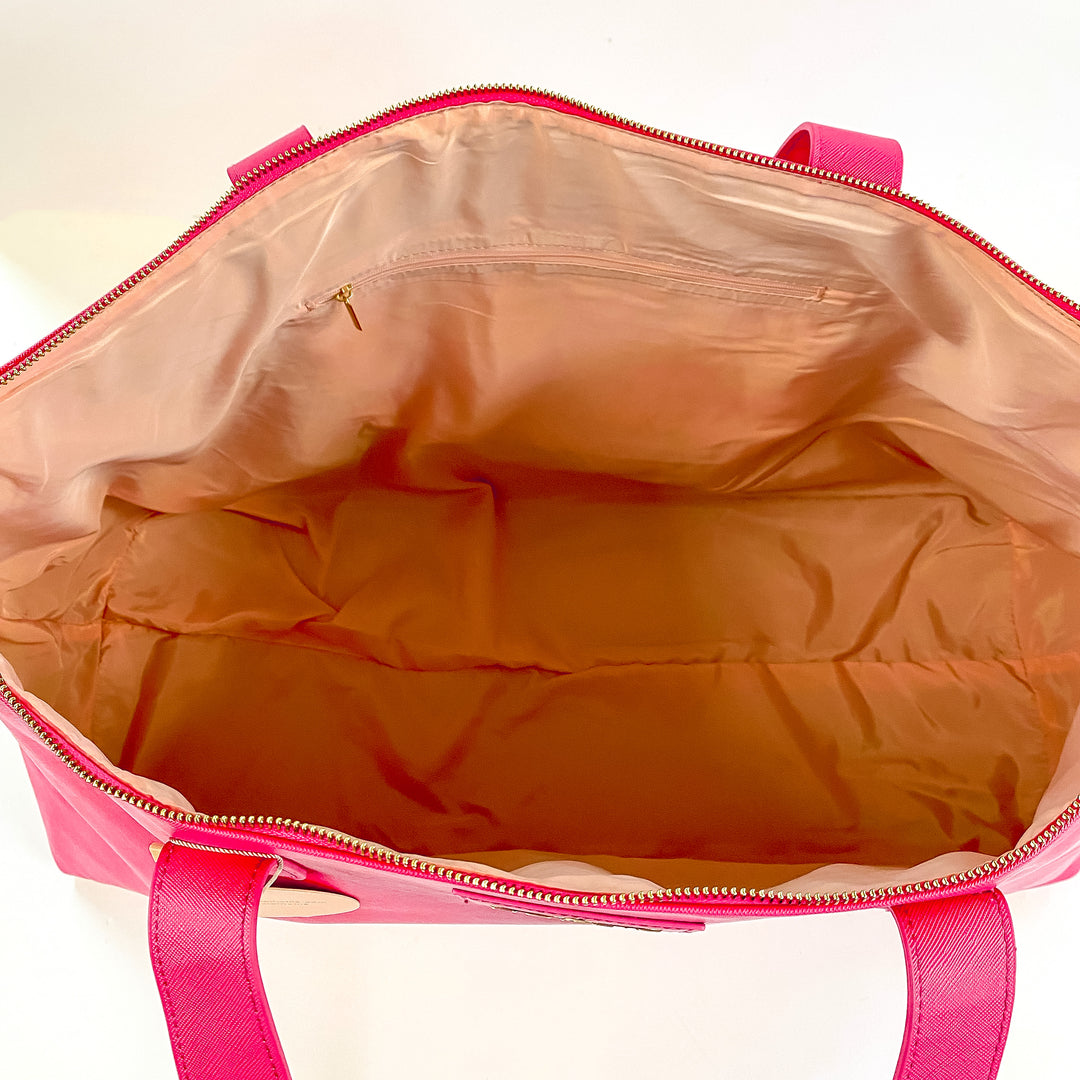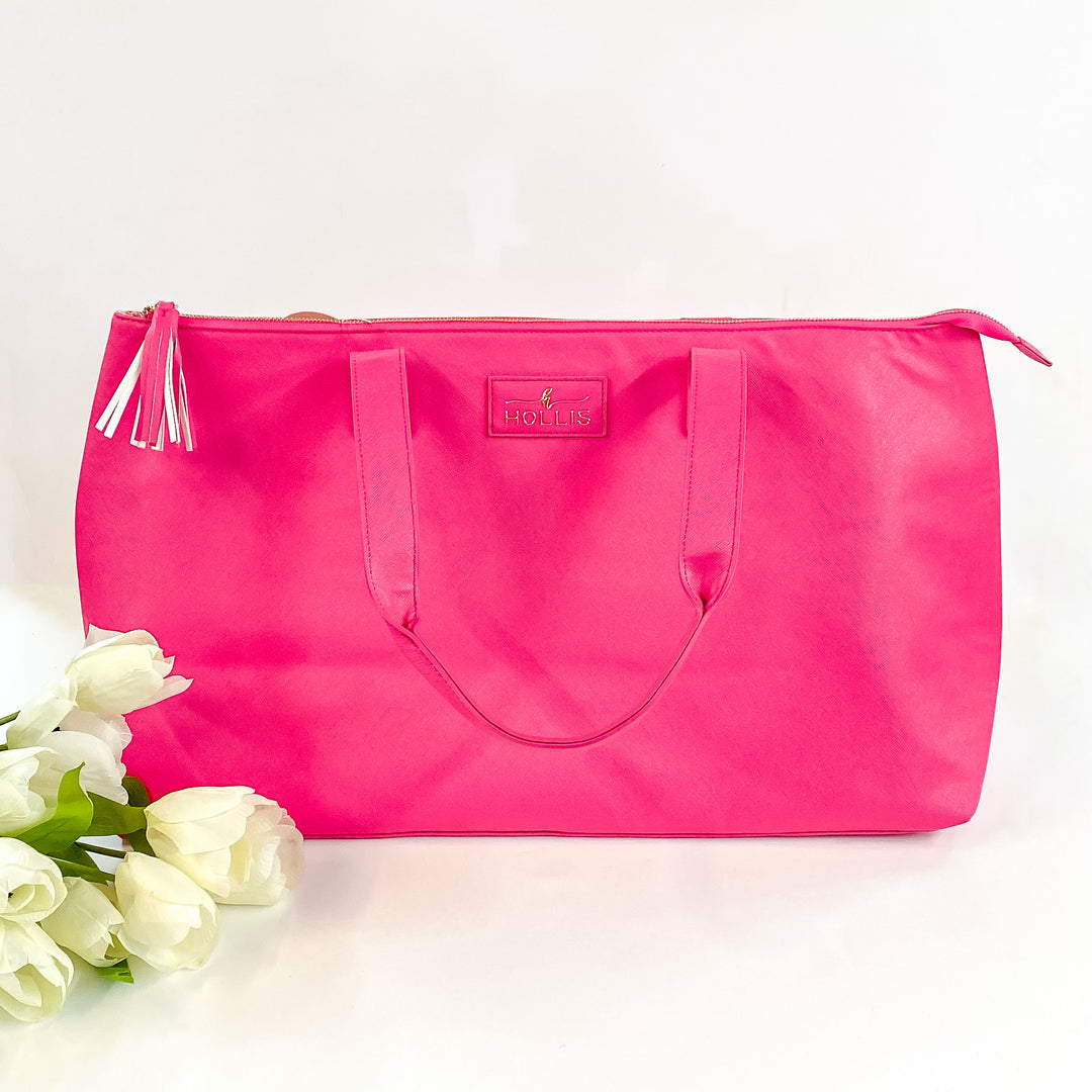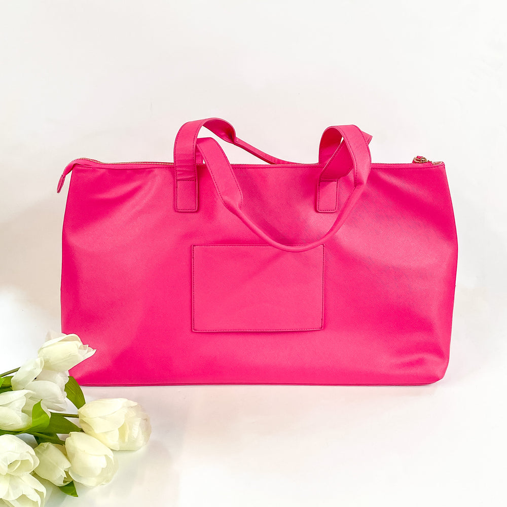 Slumber Party Overnighter! Throw in your pj's and head to your besties! This bag is perfect for all your over night stays. Luggage pocket on the back side to slip on your luggage and roll through the airport. Comfortable straps to throw over your shoulder and go!