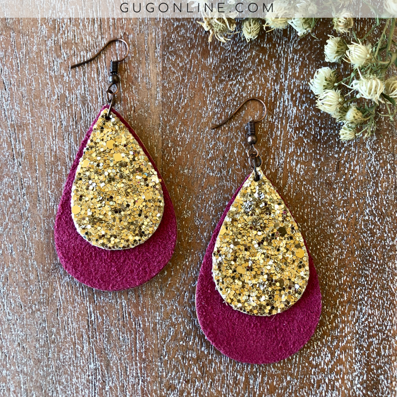 Small Leather Teardrop Earrings with Gold Glitter Accent in Magenta