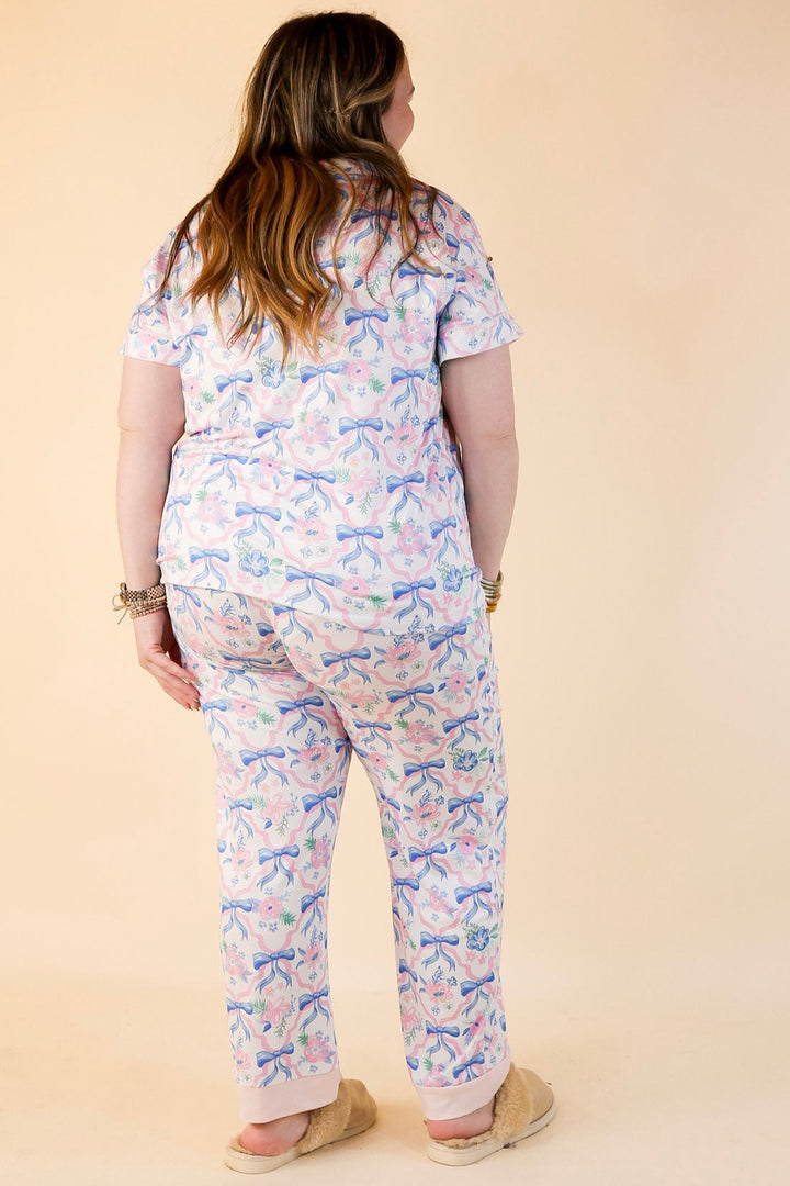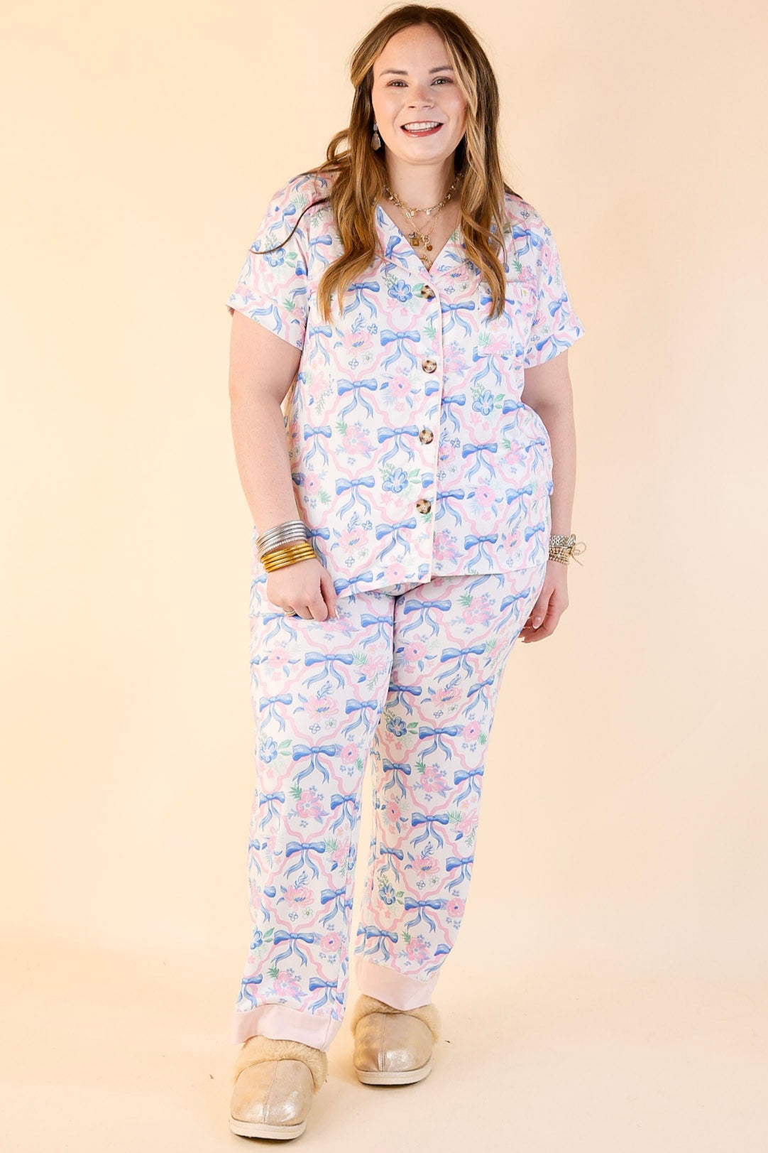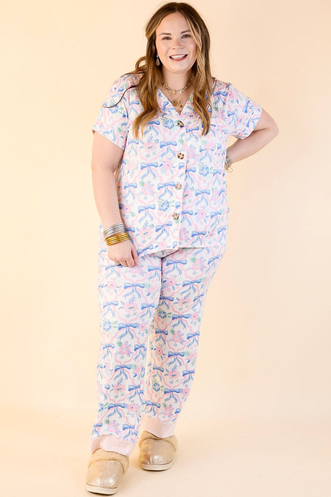 Get ready to unwind in the Snooze in Style pajama pants, where effortless comfort meets timeless charm. These full-length pajama pants feature a delicate blue ribbon bow print on an off-white background, creating a soft, feminine look perfect for lounging or sleeping. Designed with an elastic waistband, they offer a flexible, relaxed fit for all-night comfort. Pair them with the matching button-up pajama top for a chic and coordinated sleepwear set.