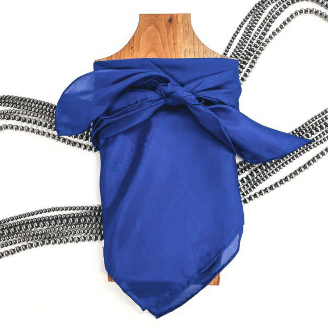 This is a royal blue silk wild rag, this wild rag is placed on a brown necklace board. This wild rag is taken on a white background and with silver Navajo pearls in the back as decor.