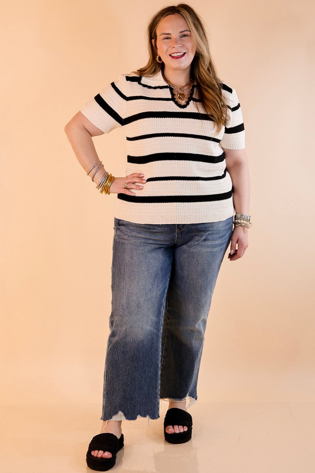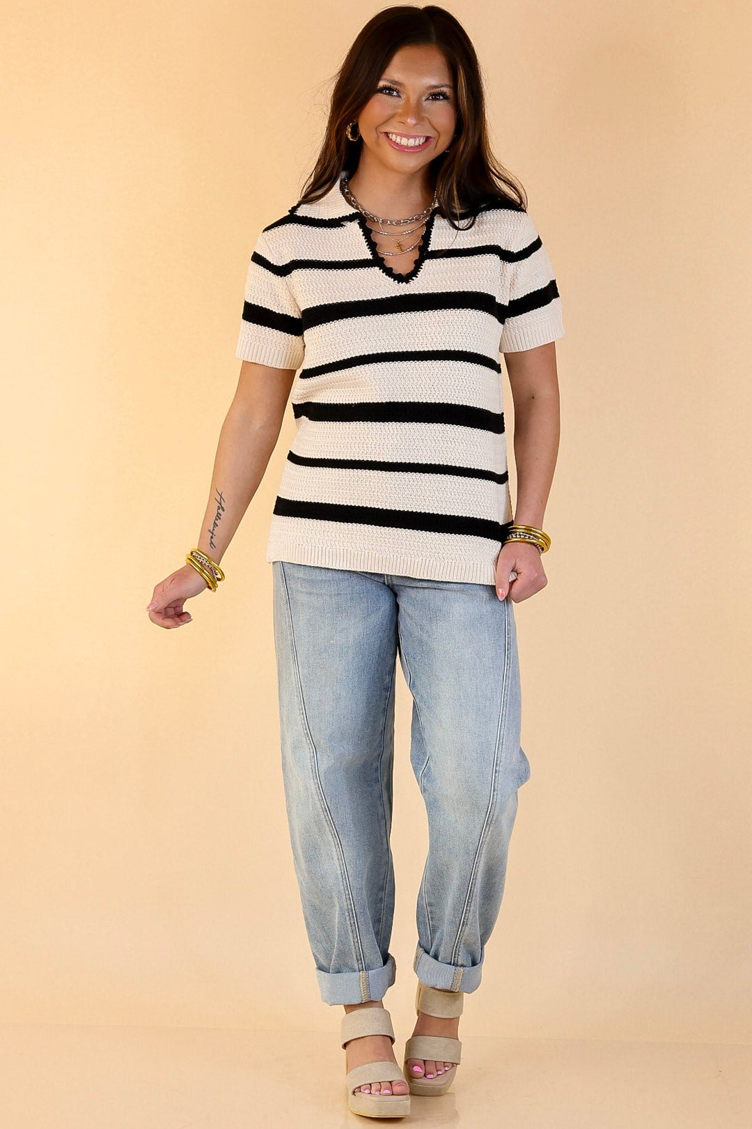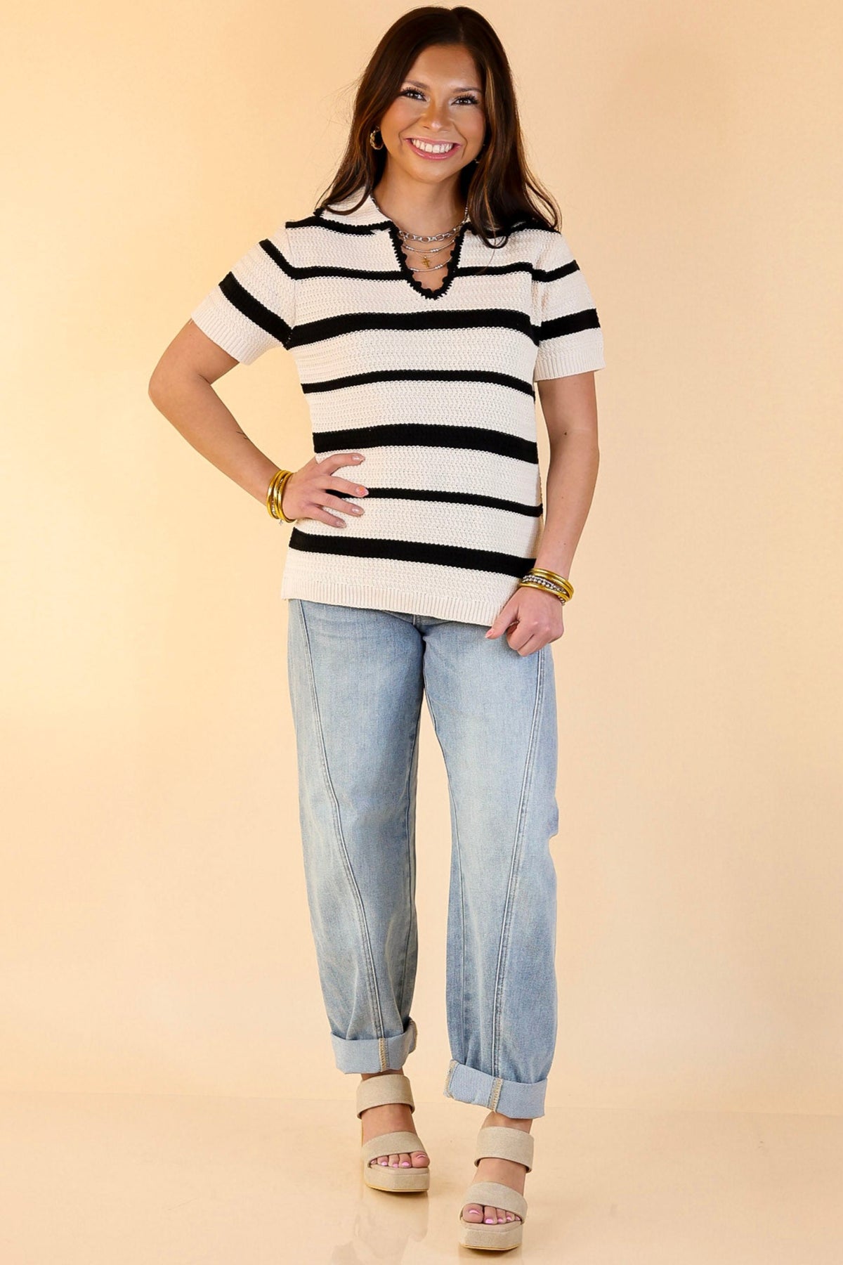 Sophisticated Chic Striped Knit Top with Collar in Off White and Black