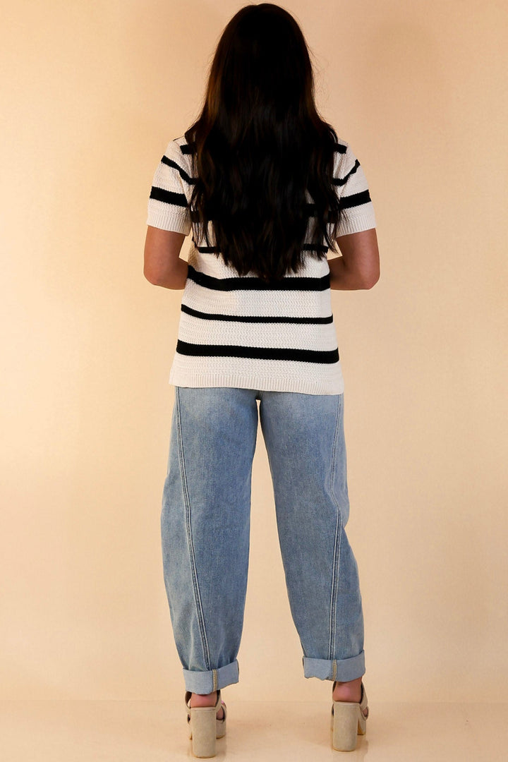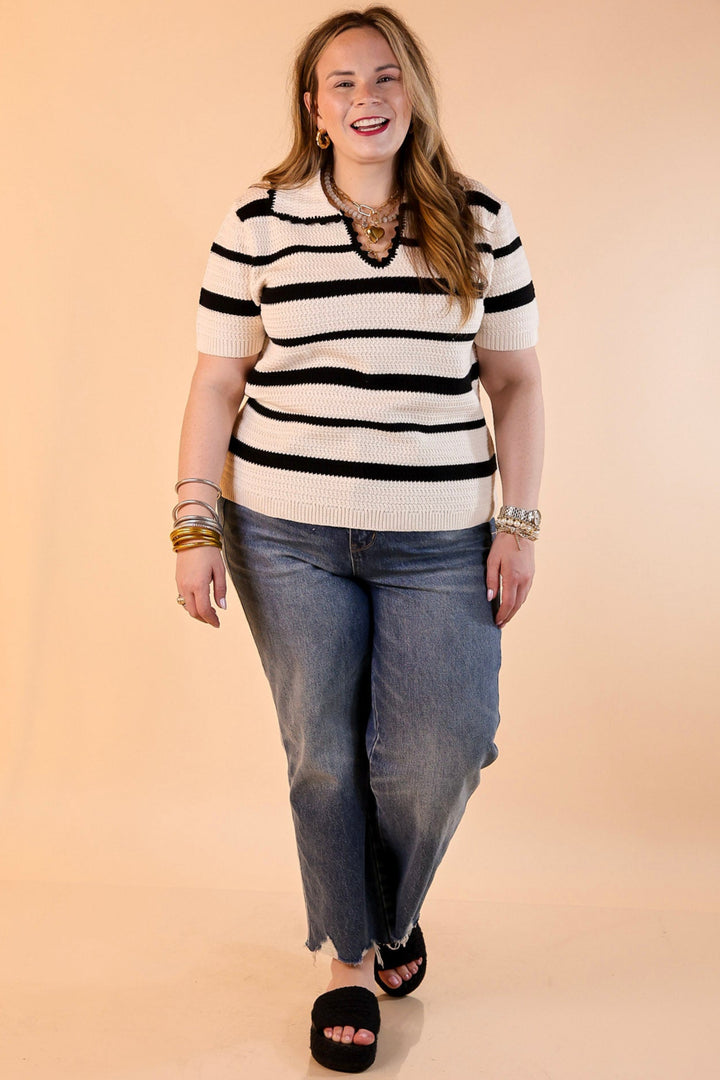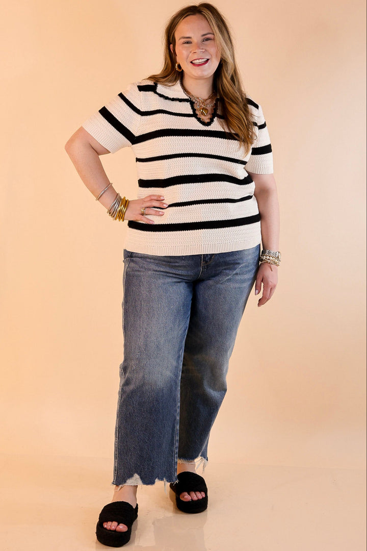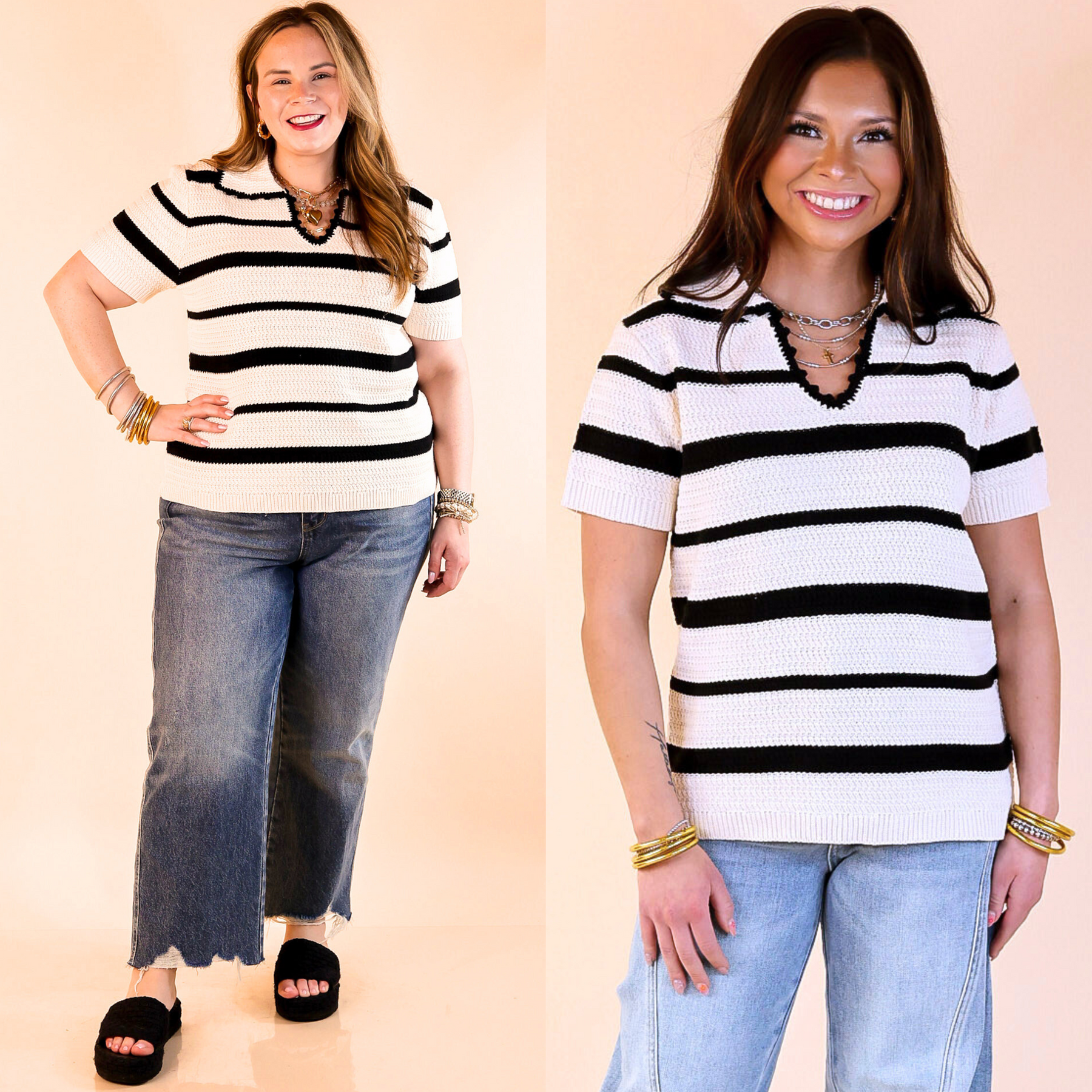 Sophisticated Chic Striped Knit Top with Collar in Off White and Black