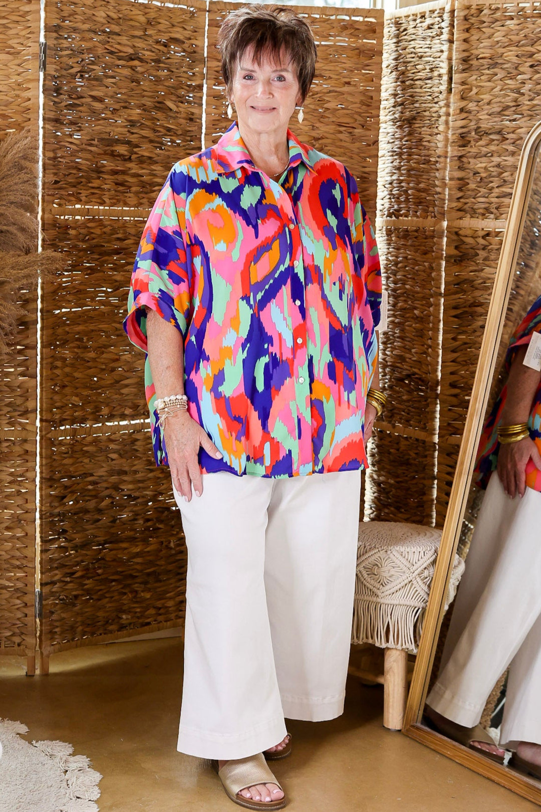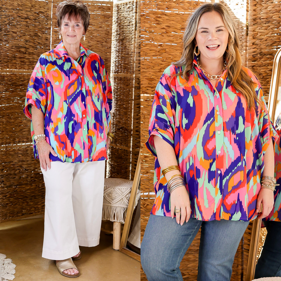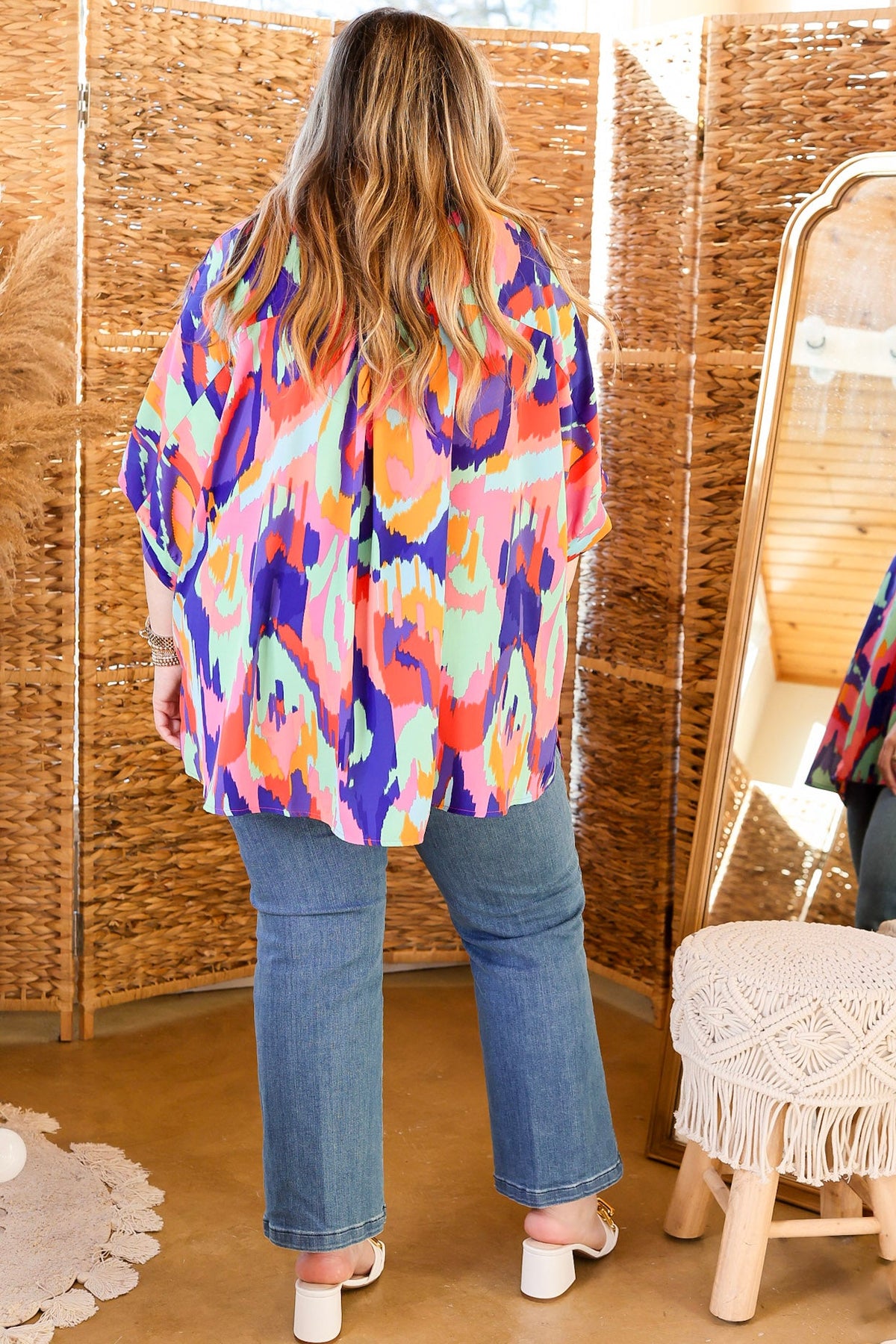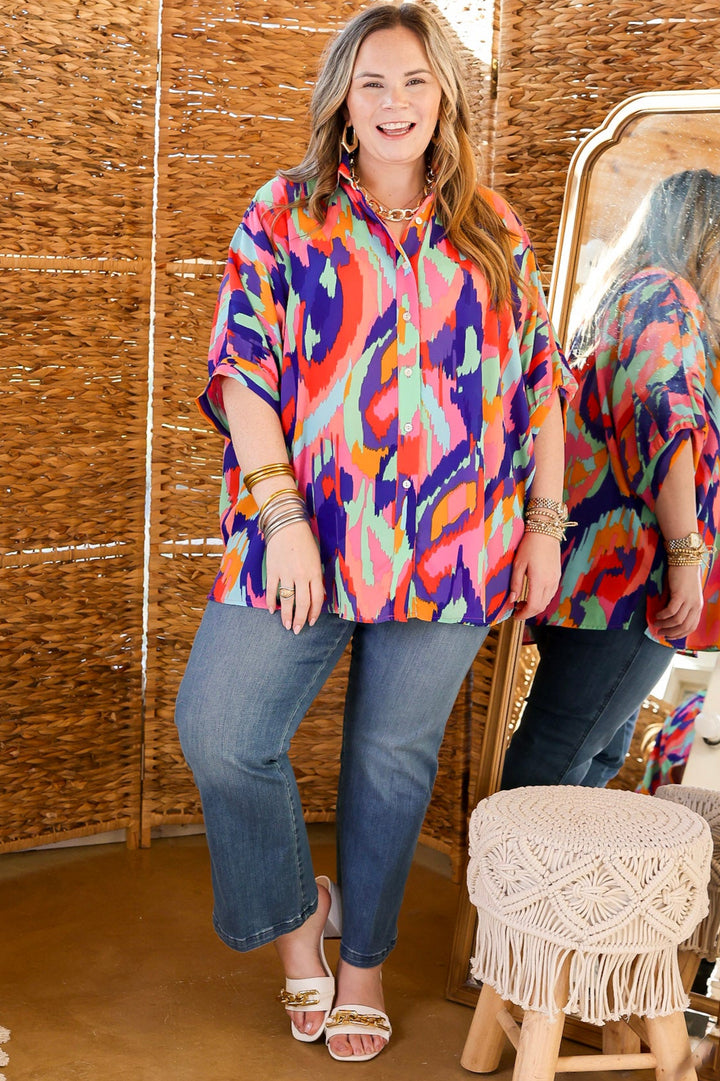 Stay fashionable in the Sophisticated Sweetie Button Up Brush Stroke Print Poncho Top. This oversized half sleeve top features a mix of pink, red, orange, and royal blue. Button up for a stylish look that is sure to turn heads.