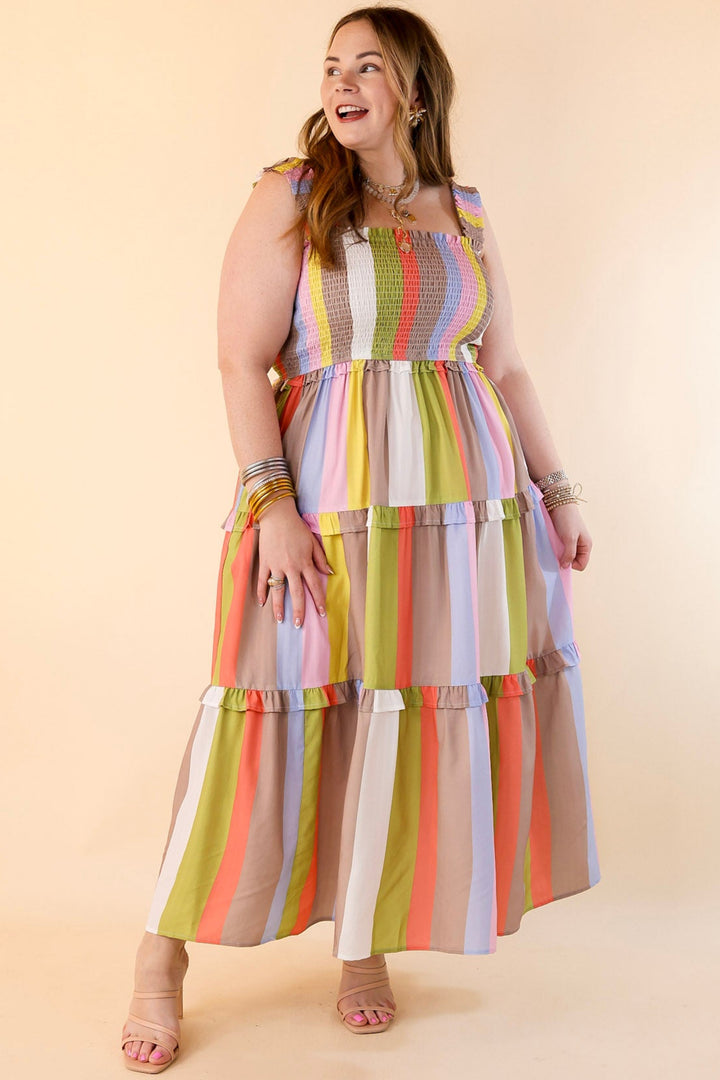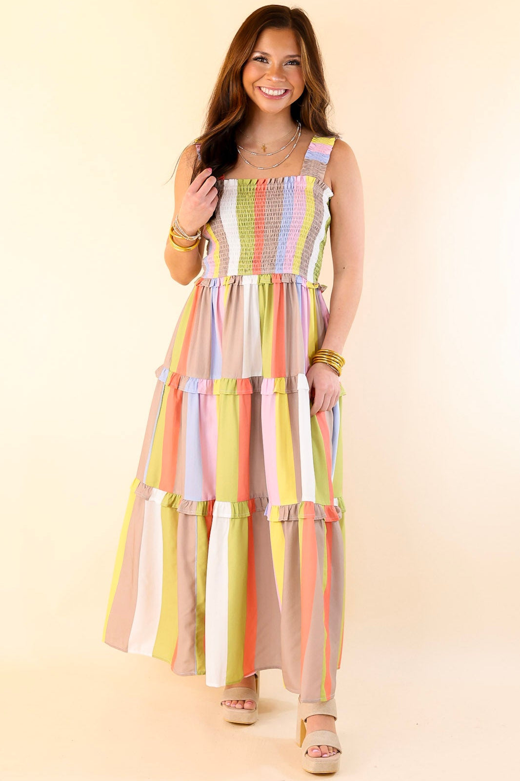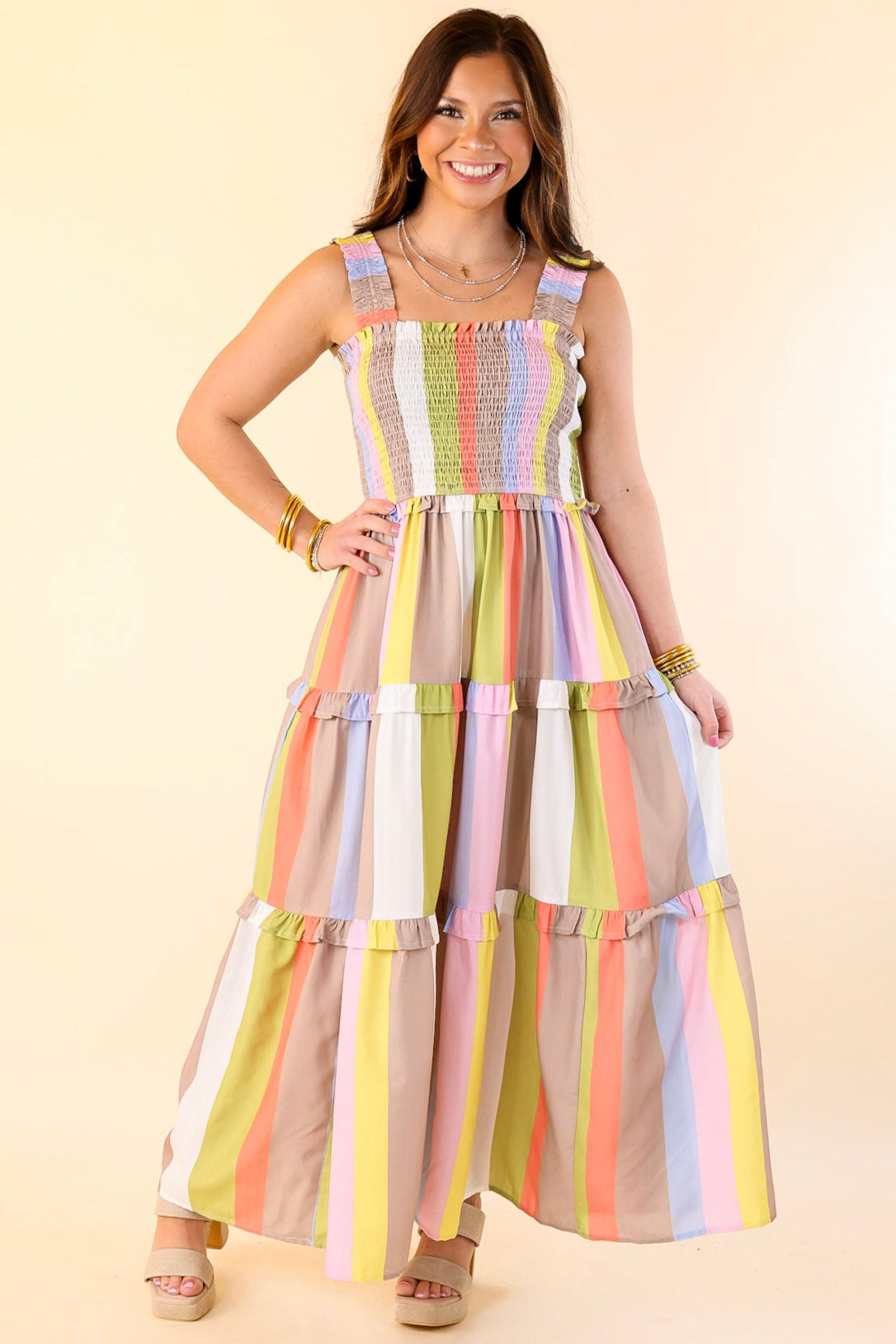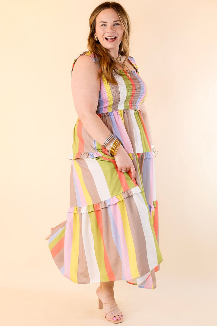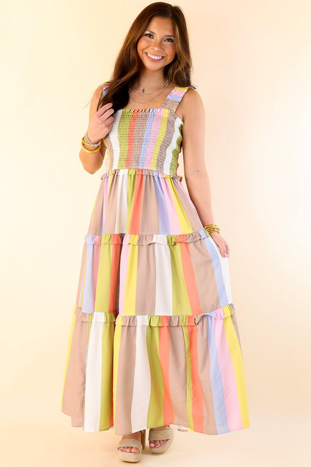 Make a statement in the Spin in Style dress—your go-to for effortless elegance and playful charm. This vibrant maxi dress features a tiered silhouette that flows beautifully with every step, making it perfect for twirling the day away. The smocked bodice offers a flattering and comfortable fit, while the multicolored striped pattern adds a fun, eye-catching touch. Whether you're headed to brunch, a beach vacation, or a spring wedding, this dress is the perfect blend of comfort and style.