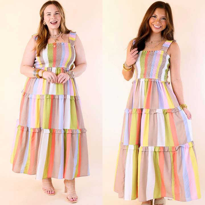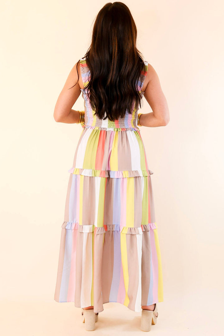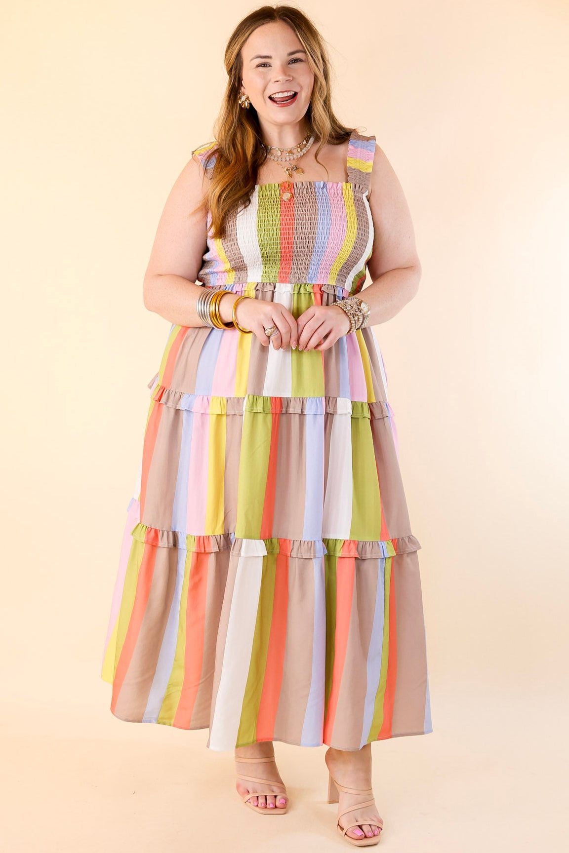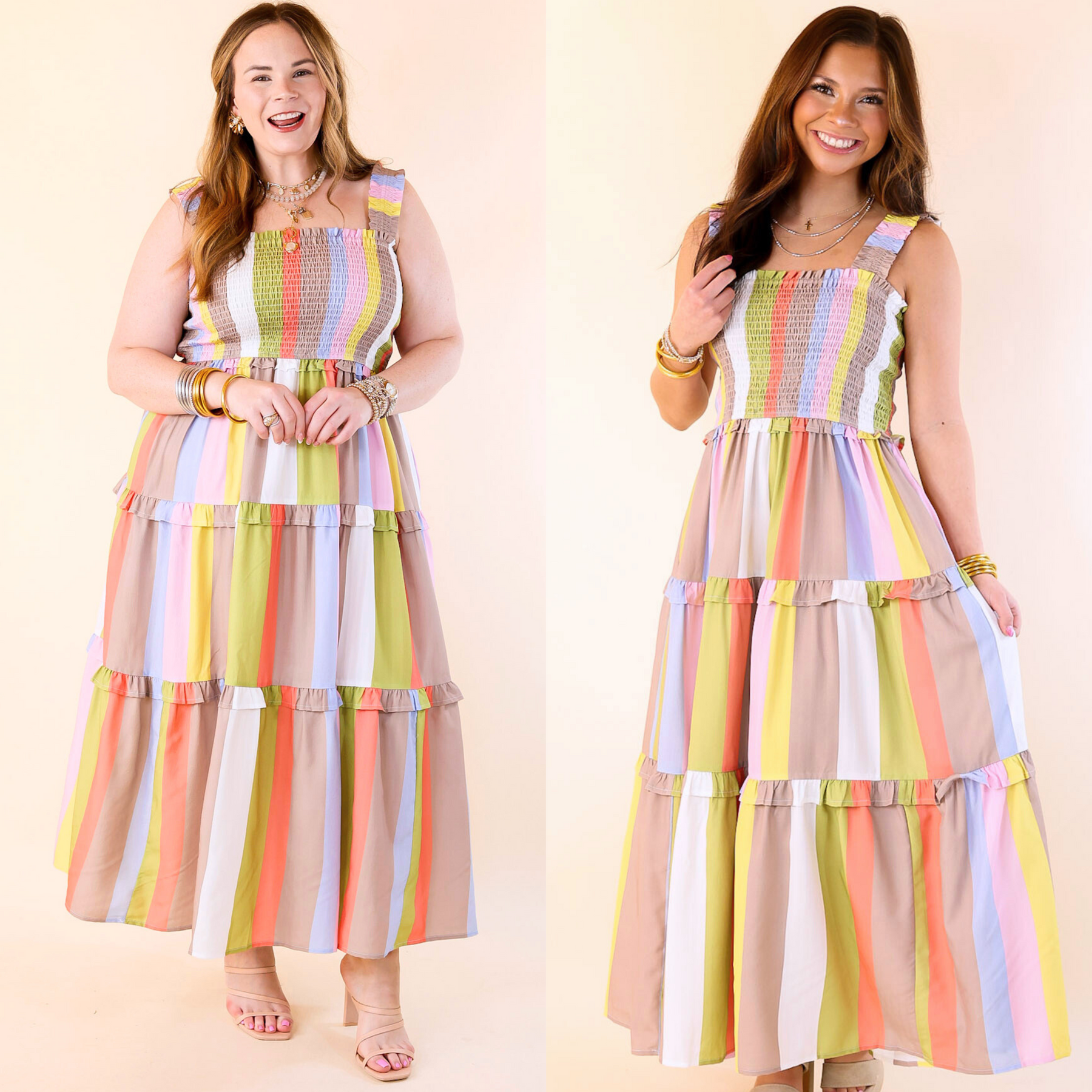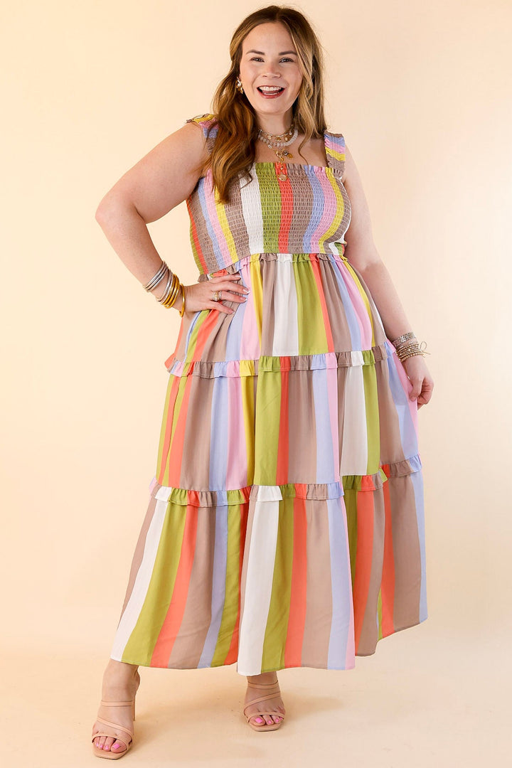 Make a statement in the Spin in Style dress—your go-to for effortless elegance and playful charm. This vibrant maxi dress features a tiered silhouette that flows beautifully with every step, making it perfect for twirling the day away. The smocked bodice offers a flattering and comfortable fit, while the multicolored striped pattern adds a fun, eye-catching touch. Whether you're headed to brunch, a beach vacation, or a spring wedding, this dress is the perfect blend of comfort and style.