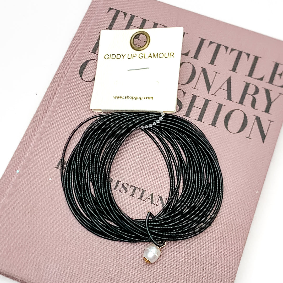 Spring Wire Elastic Bracelet Set in Black with a Pearl Charm