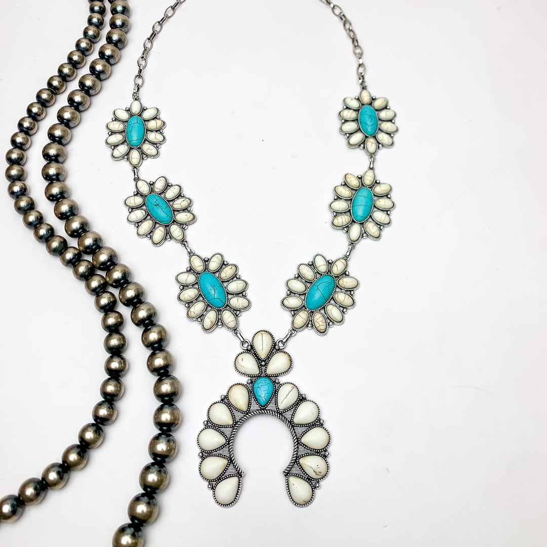 This stunning silver, turquoise, and white squash necklace with oval flowers is sure to turn heads. Enjoy its elegant design and eye-catching beauty. Perfect for completing any outfit.