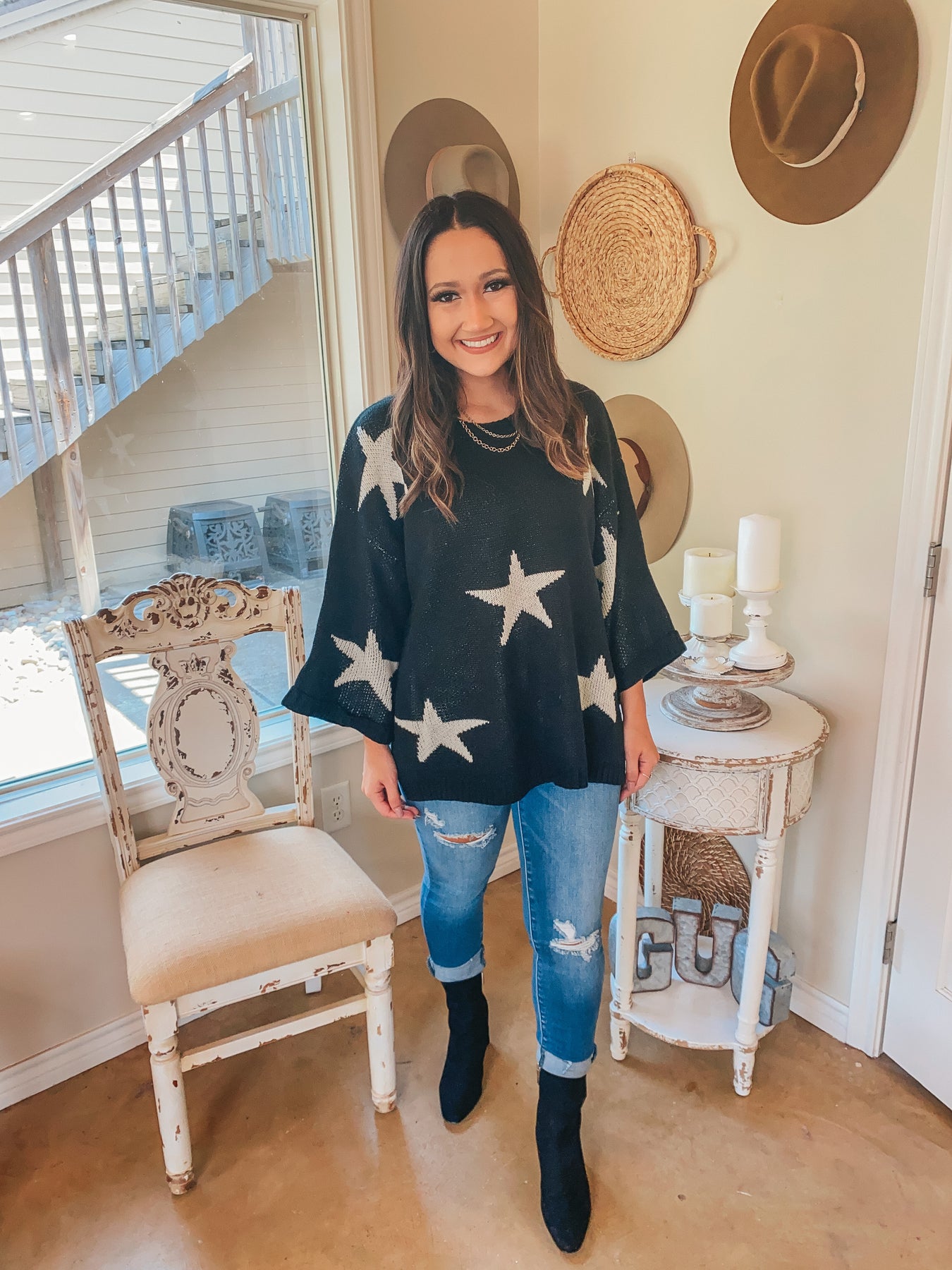 Keep your dreams as bright as the stars on this adorable sweater! It includes a scoop neckline, wide sleeves, an oversized fit, and an ivory star print on a black background. Pair this with skinnies and booties for a trendy look this season! Lily is wearing size small.