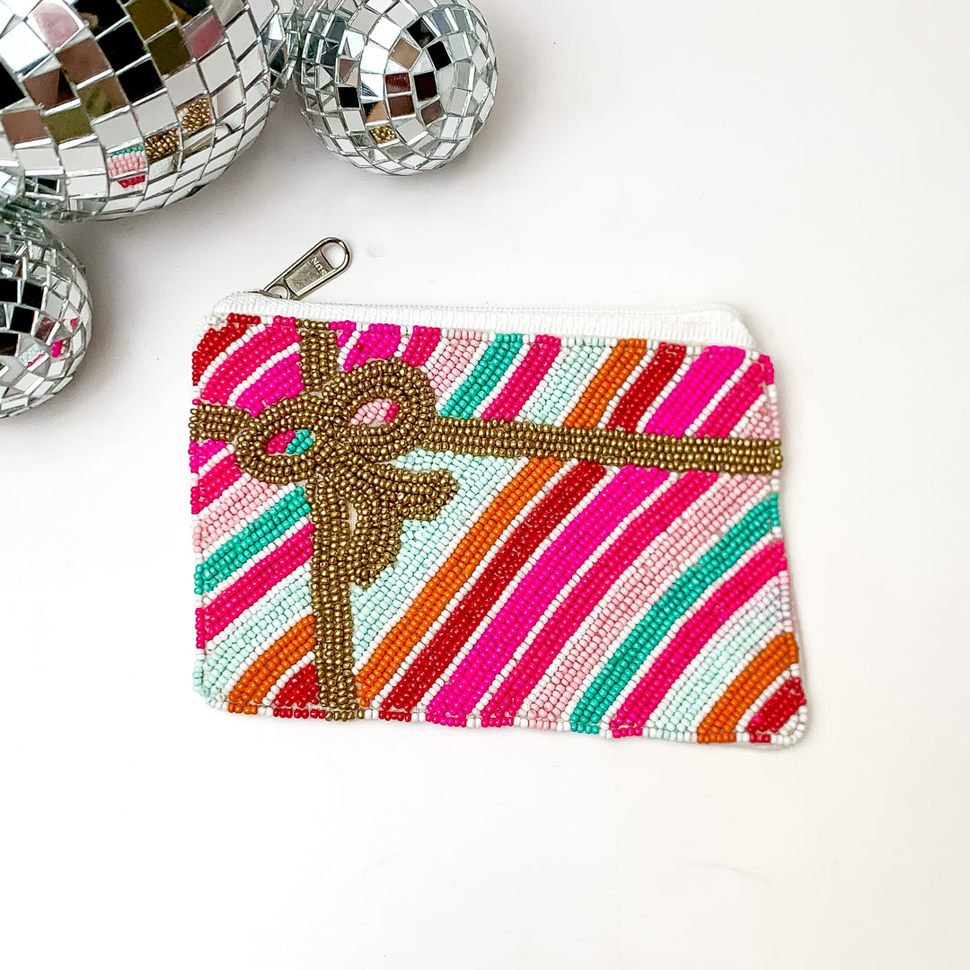 Striped Beaded Coin Purse with Gold Ribbon in Multicolor