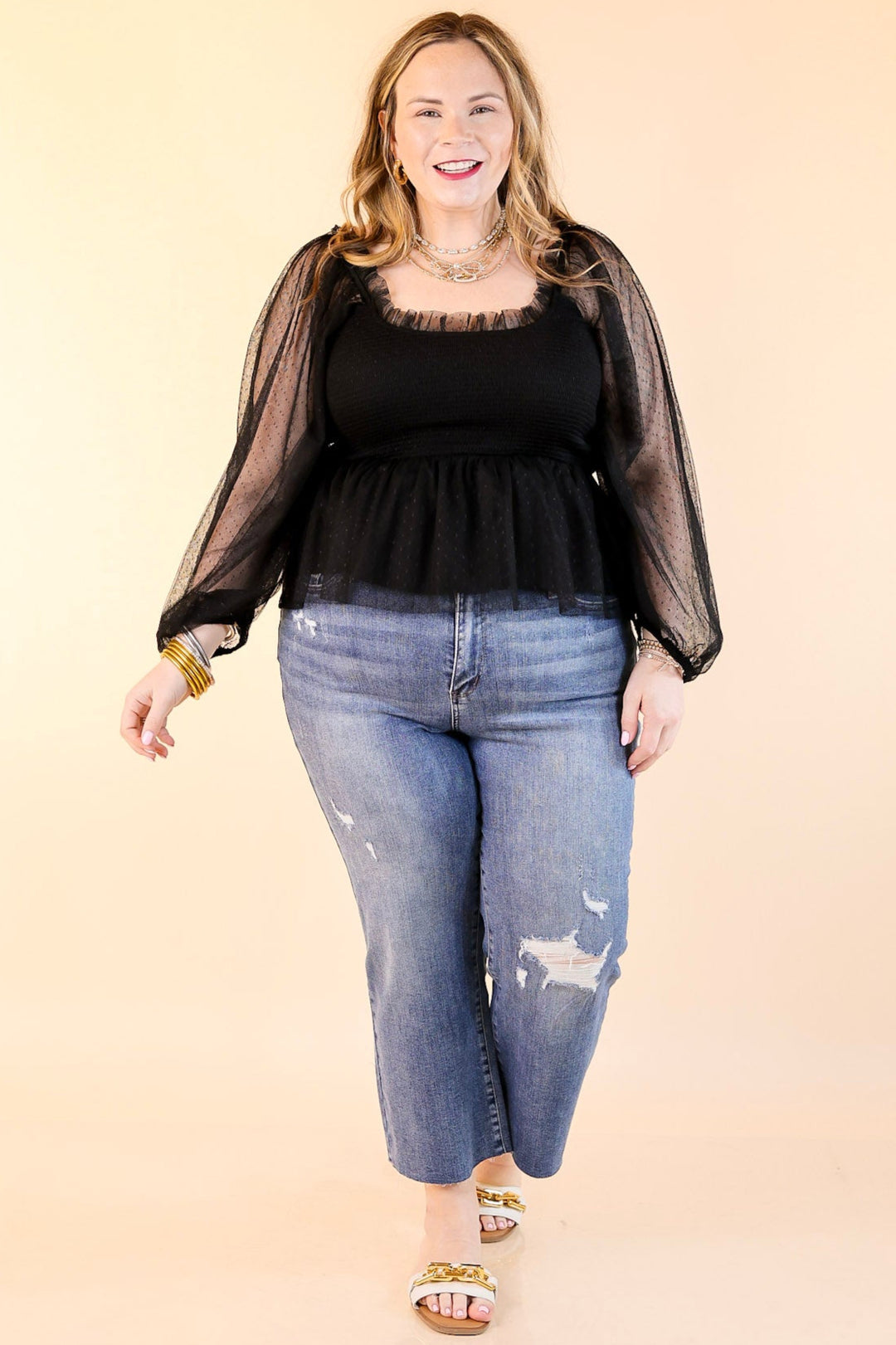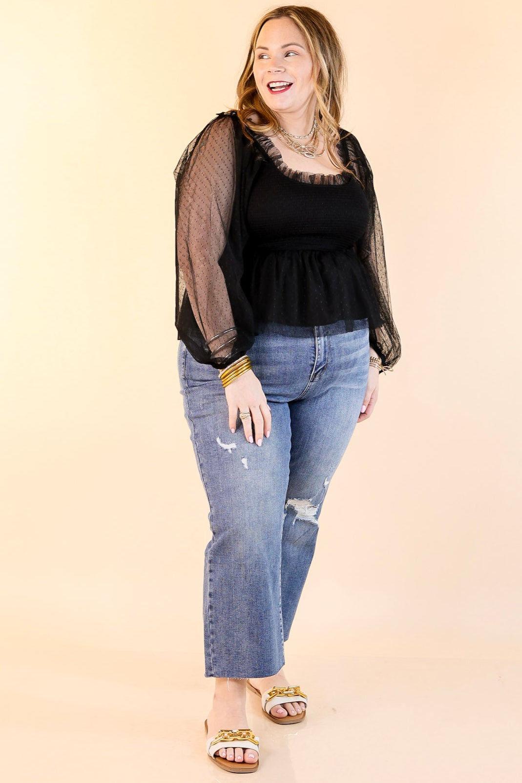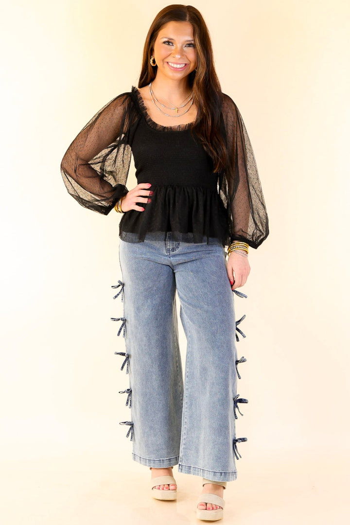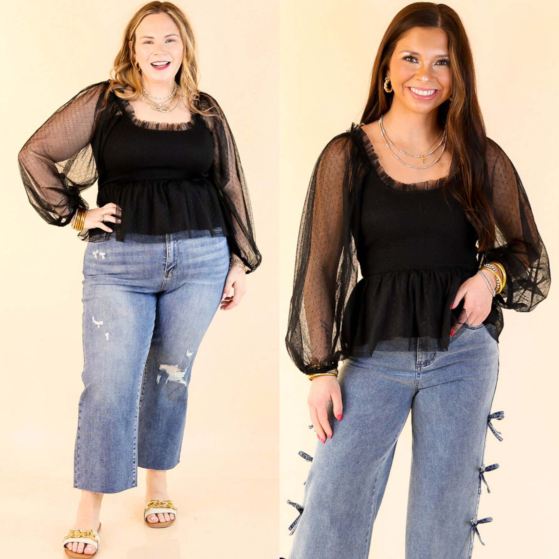 Meet your new go-to for date nights, girls’ dinners, and everything in between. The Subtle Statement Top is a black long sleeve blouse featuring a flattering smocked bodice, sheer balloon sleeves, and delicate ruffle details at the neckline and hem. The perfect mix of chic and feminine, this top pairs effortlessly with high-waisted jeans or a sleek skirt for an elevated look with just the right amount of drama.