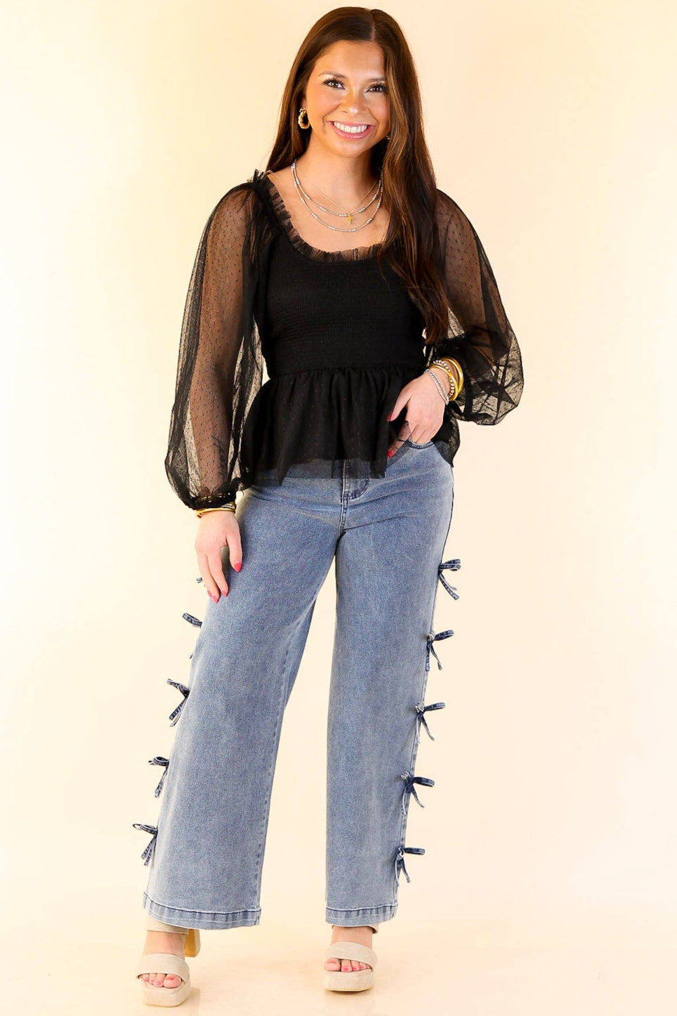 Subtle Statement Smocked Bodice Top with Sheer Puff Sleeves in Black