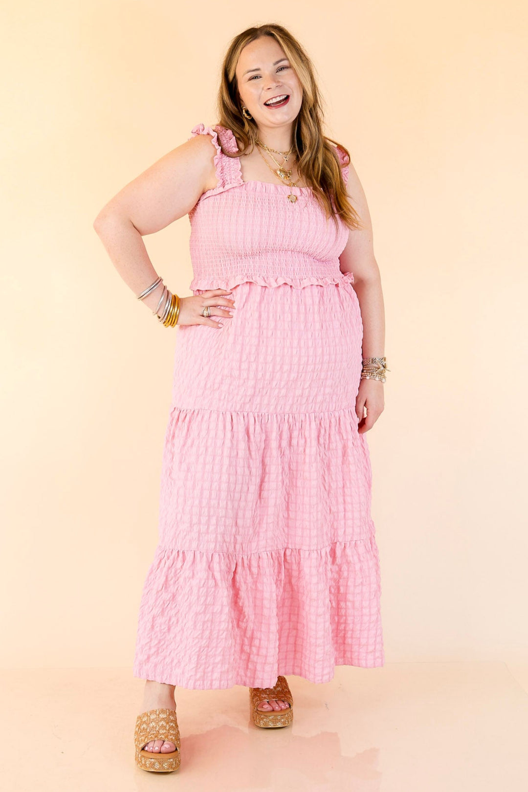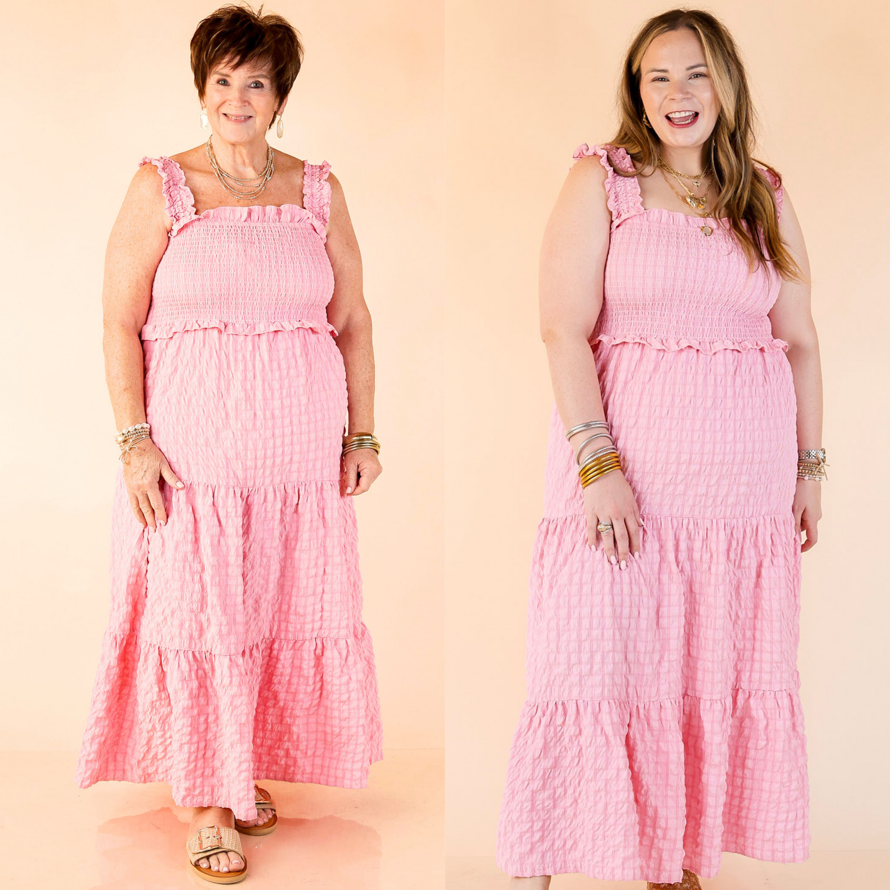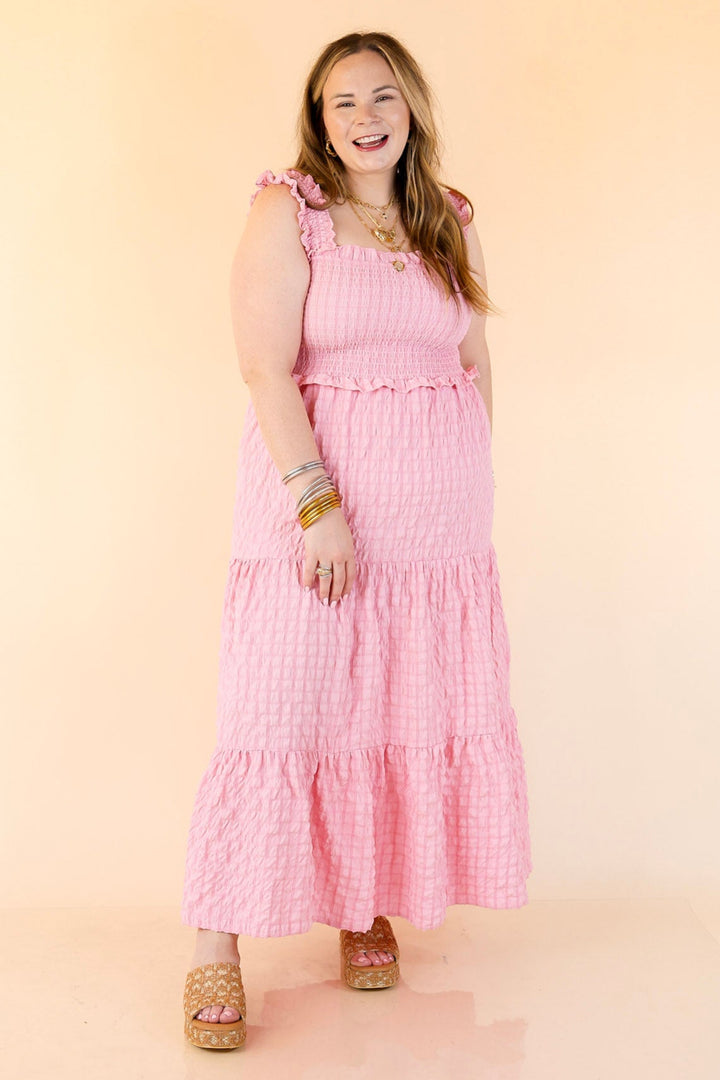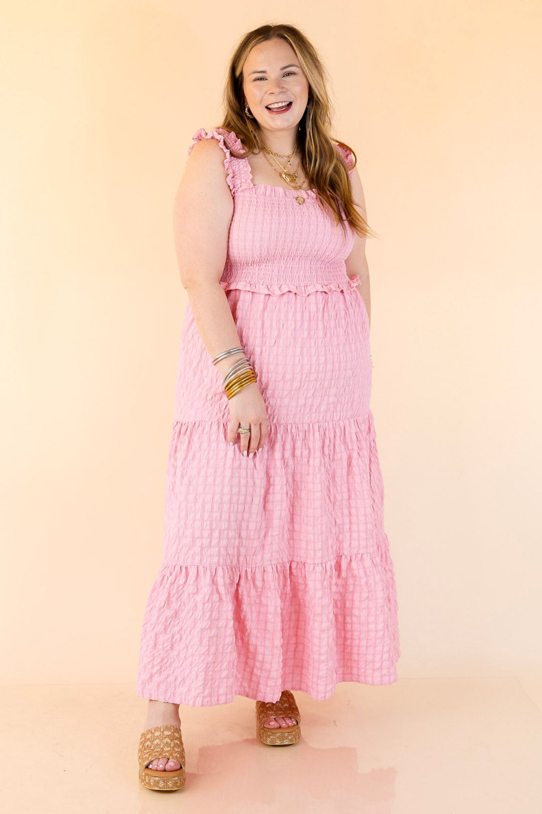 Pretty, polished, and ready for sunshine. The Summer Muse Maxi Dress is a classic sundress with a fresh twist—featuring a sweet pink plaid print and softly ruched fabric that adds just the right amount of texture. The smocked bodice offers a flattering, flexible fit while the full-length flowy skirt keeps things breezy and timeless. Whether you're headed to a picnic, a patio dinner, or just soaking up the sun, this dress is pure summer charm in motion.